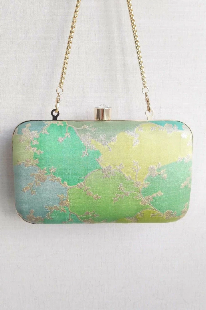 Be the first to review “AMYRA Abstract Art Pure Silk Banarasi Clutch – Green” Cancel reply