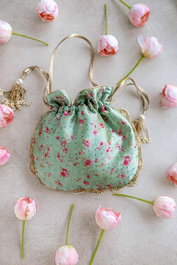 - Material : Printed silk, gold tissue, poly satin lining, woven gold thread drawstrings and pearl embellished scallop lace and handle, cutdana tassels