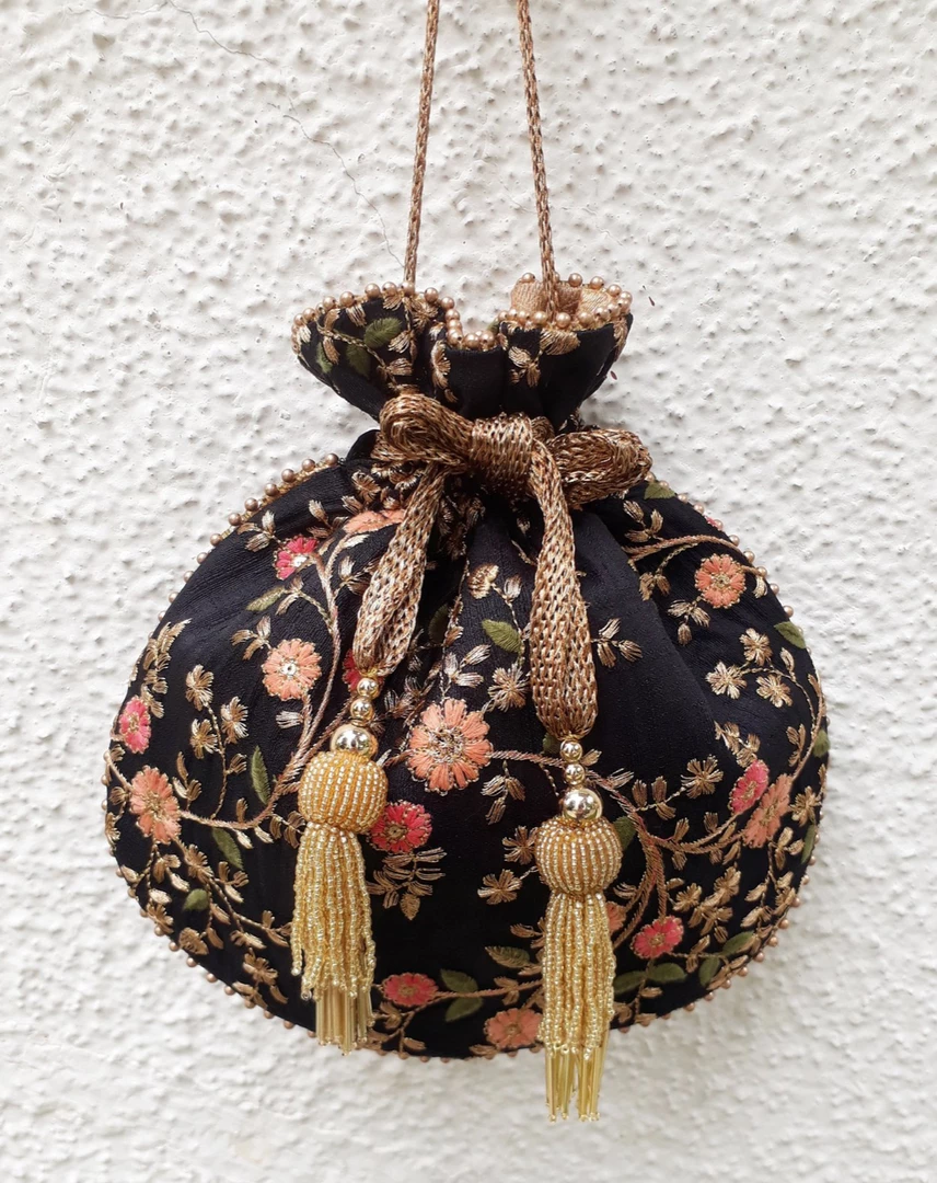 - Material : Embroidered poly silk, poly satin lining, woven golden thread drawstrings and handle, gold bead piping and tassels.