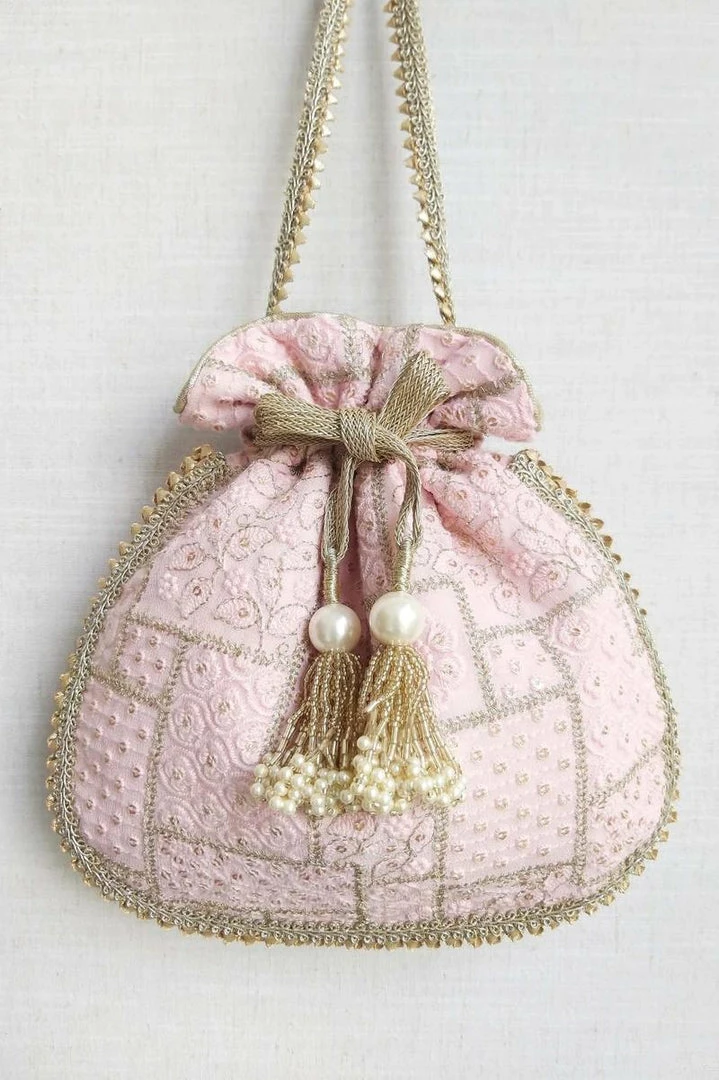 - Material : Embroidered georgette, poly satin lining, woven golden thread drawstrings and handle, cutdana and pearl tassles