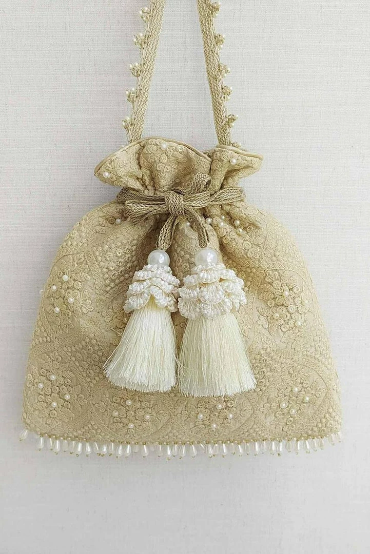 - Material : Embroidered silk, gold tissue, poly satin lining, woven gold thread drawstrings, pearl fringes and silk crochet tassle detailing.
