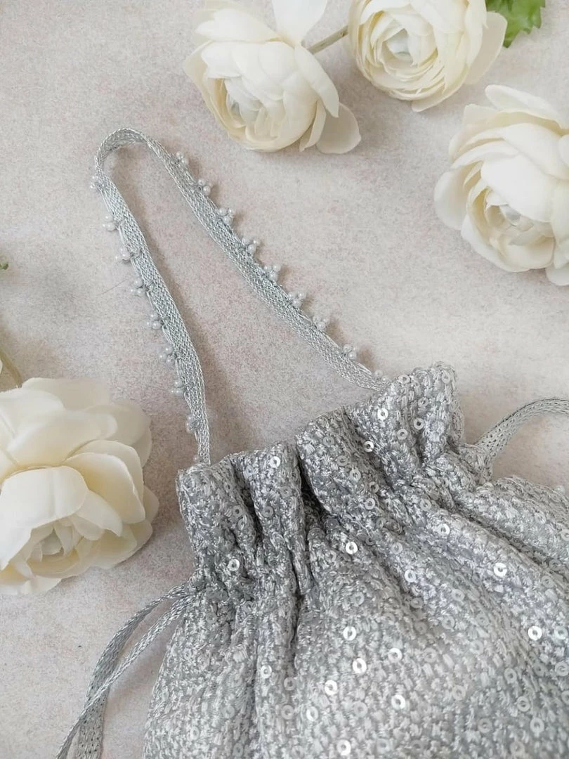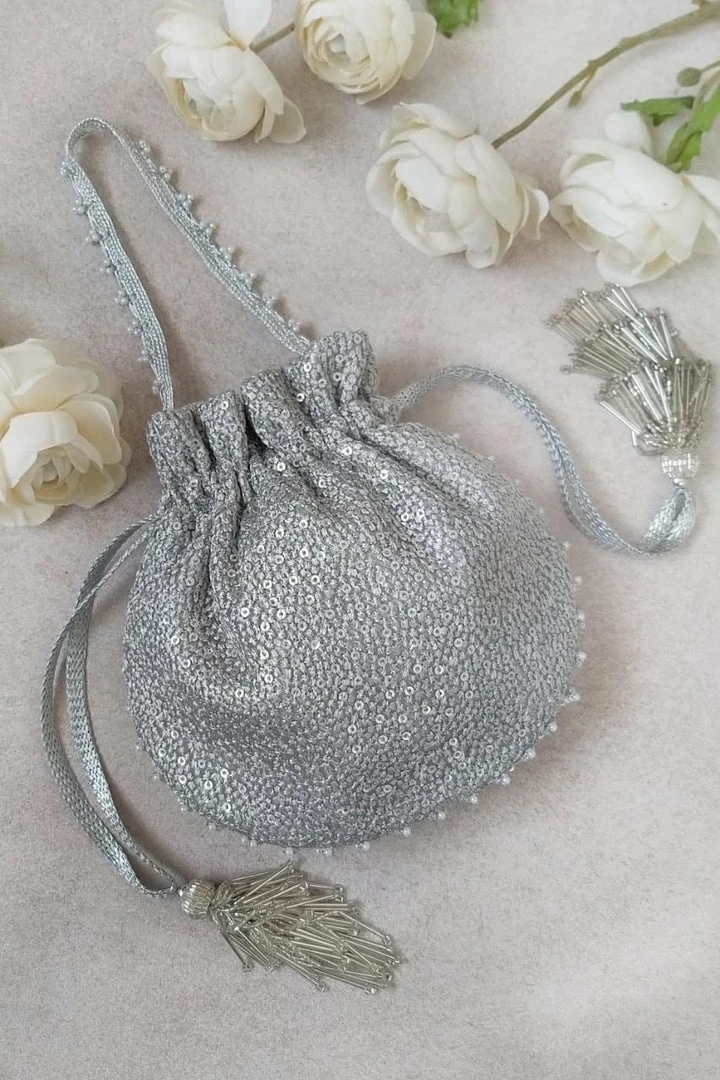 Perfect coalescence of silver, sequins on the embroidered net base and the pearl detailed tassels in sparkling elements makes our Silver sequin potli, the most sought after accessory. It’s the one that will make your heart skip a beat!