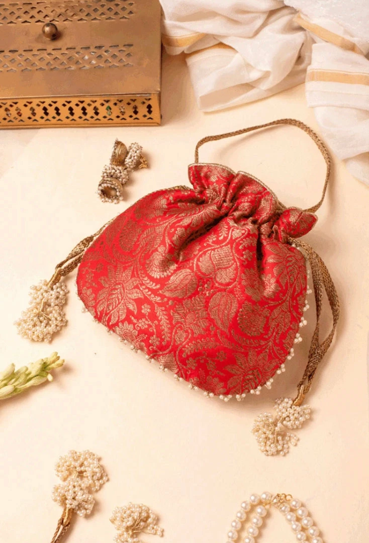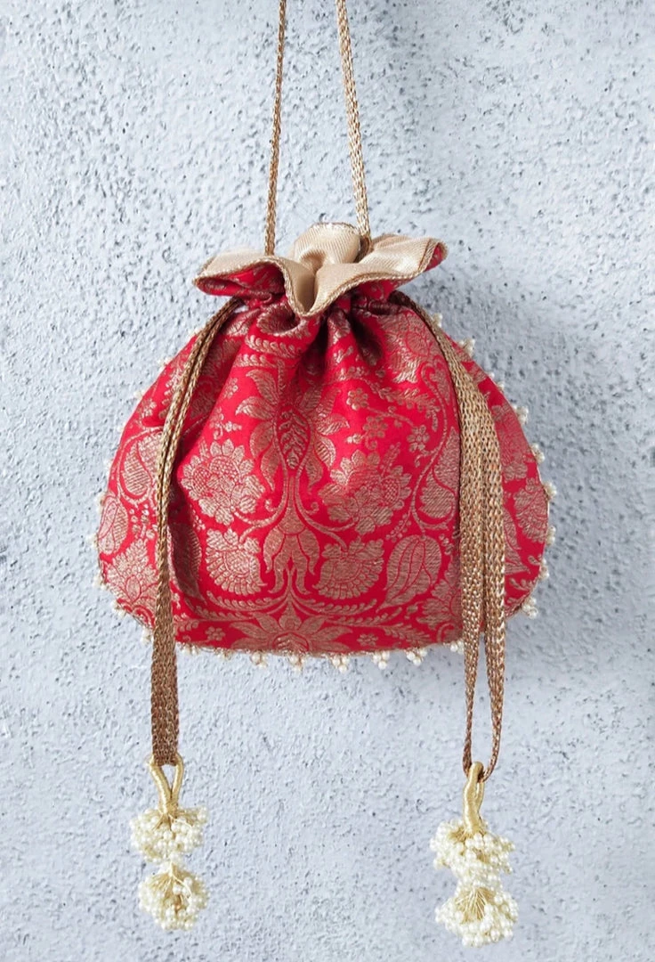 A classic potli that gels with all your beautiful traditional outfits. Crafted with pure Banarasi silk whose roots are infused in Indian craftsmanship, this potli bag is a souvenir of the time bygone and a symbol of the beautiful present.Â