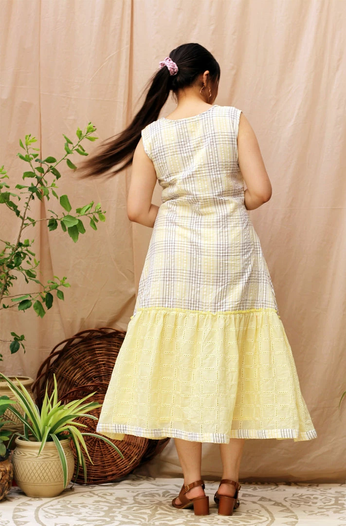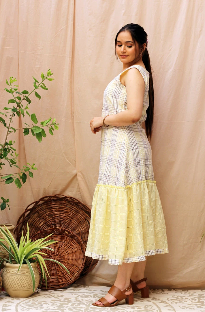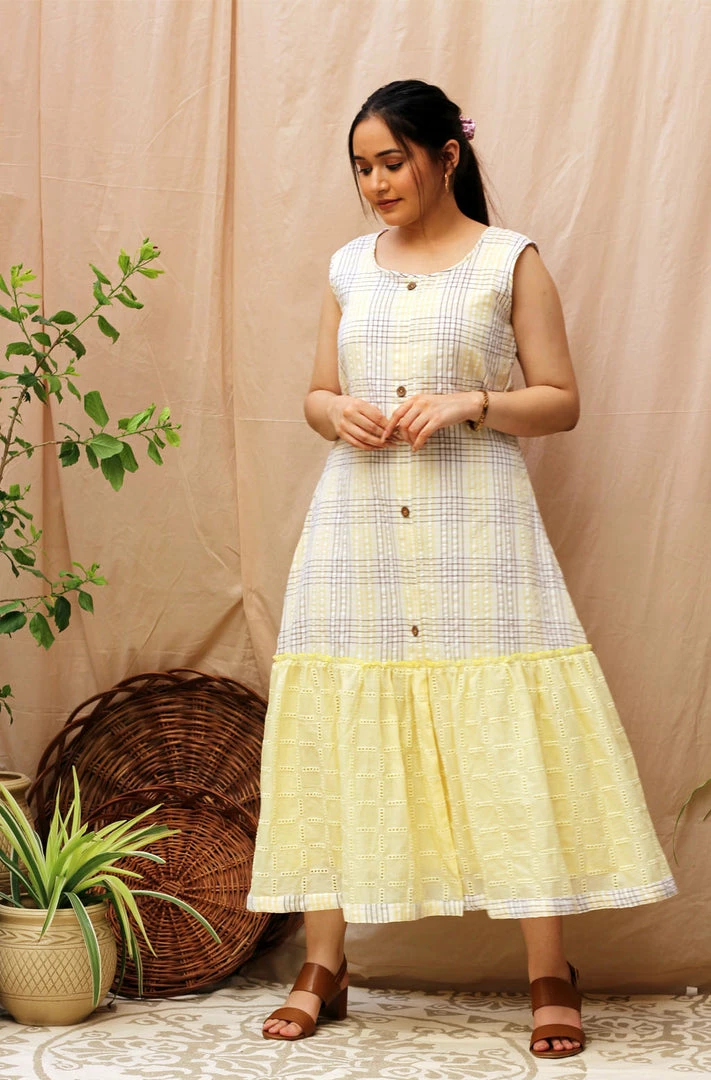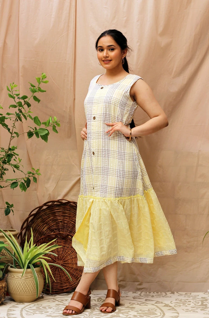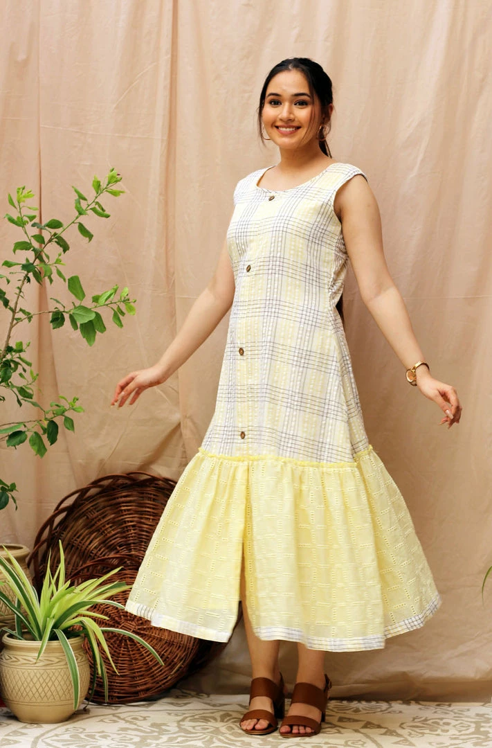 What can we say, charming is in the name! This dress is made in an A-line silhouette with self textured lemon gathers paired with white and lemon checks. Take a special look at the cool wooden buttons with a metal rim!