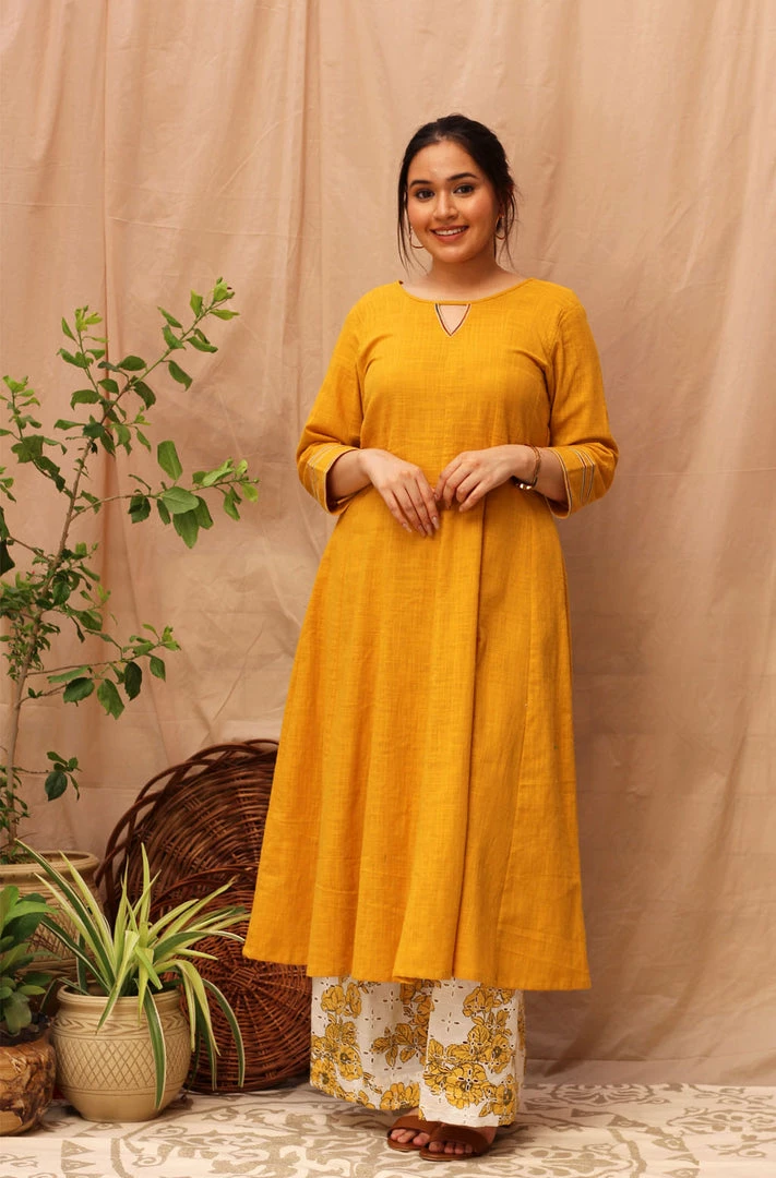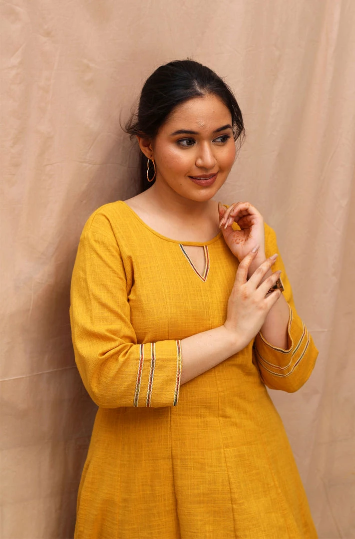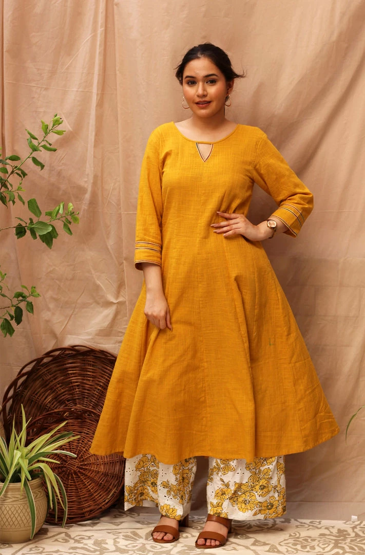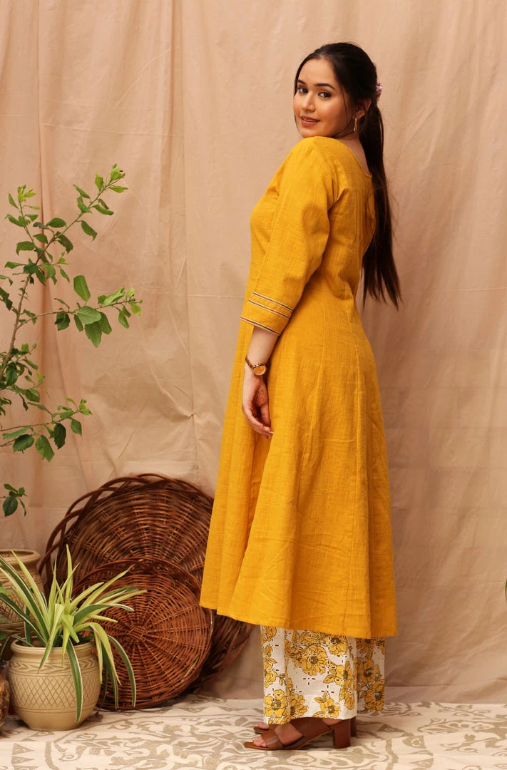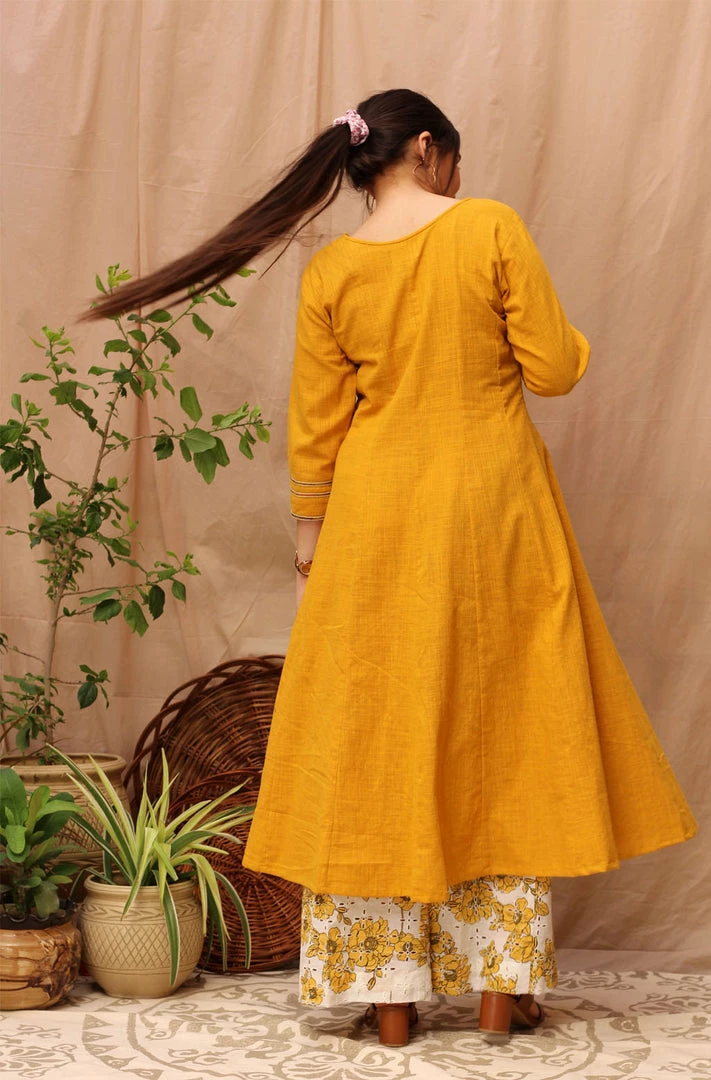 A very vibrant and versatile kurta set for this summer, the anarkali kurta comes in a bright mustard with a stylized neck. The pants in white are printed in mustard flowers and adorned with shiffli embroidery.