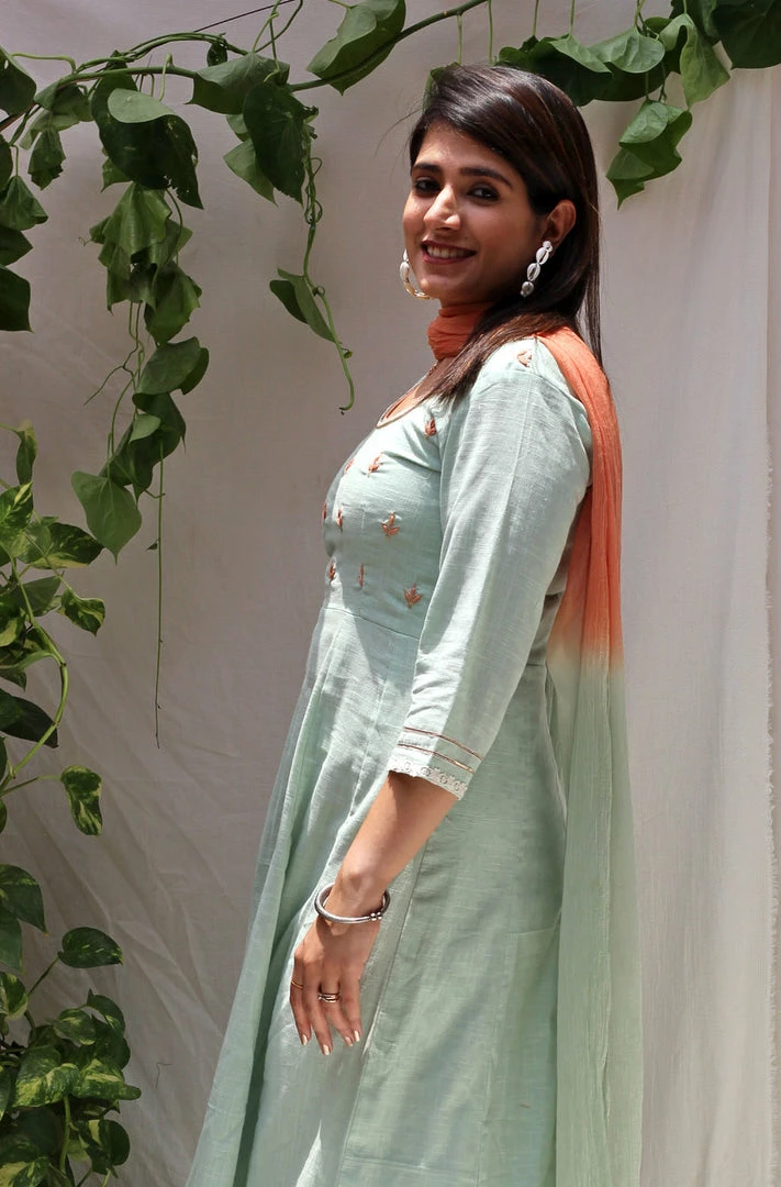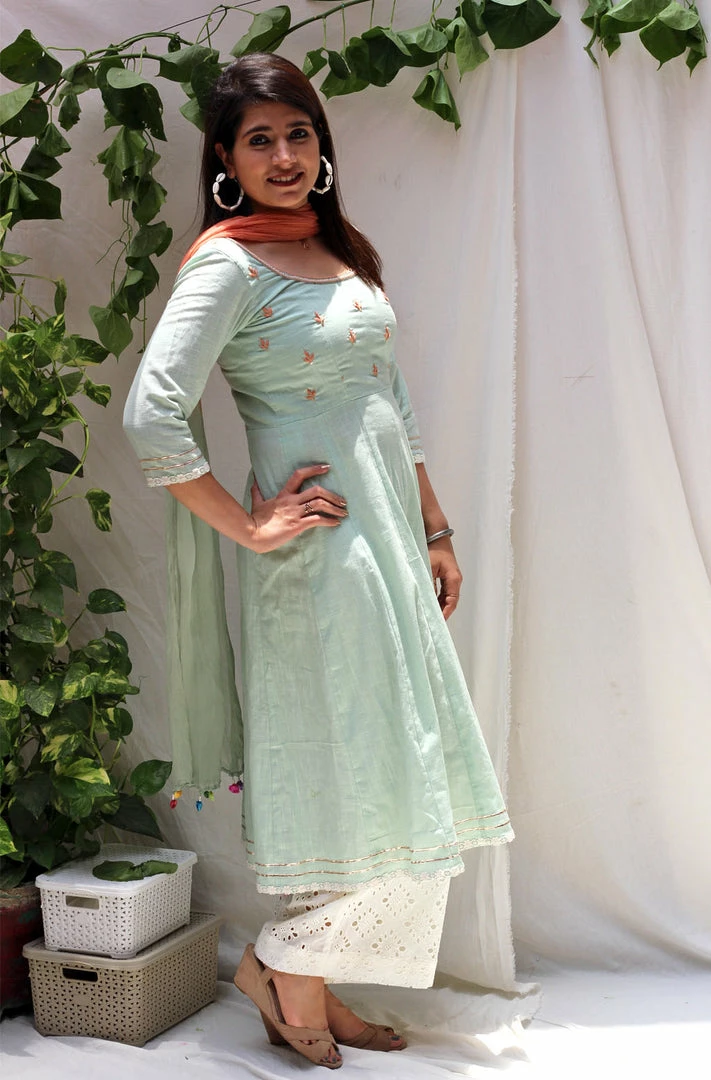 A ‘I want it all’ suit set with cotton anarkali kurta, shiffli embroidery plazo pants and chiffon double shade dupatta. The kurta is hand emroidered on the yoke in gold and peach. Perfect for your family gatherings!