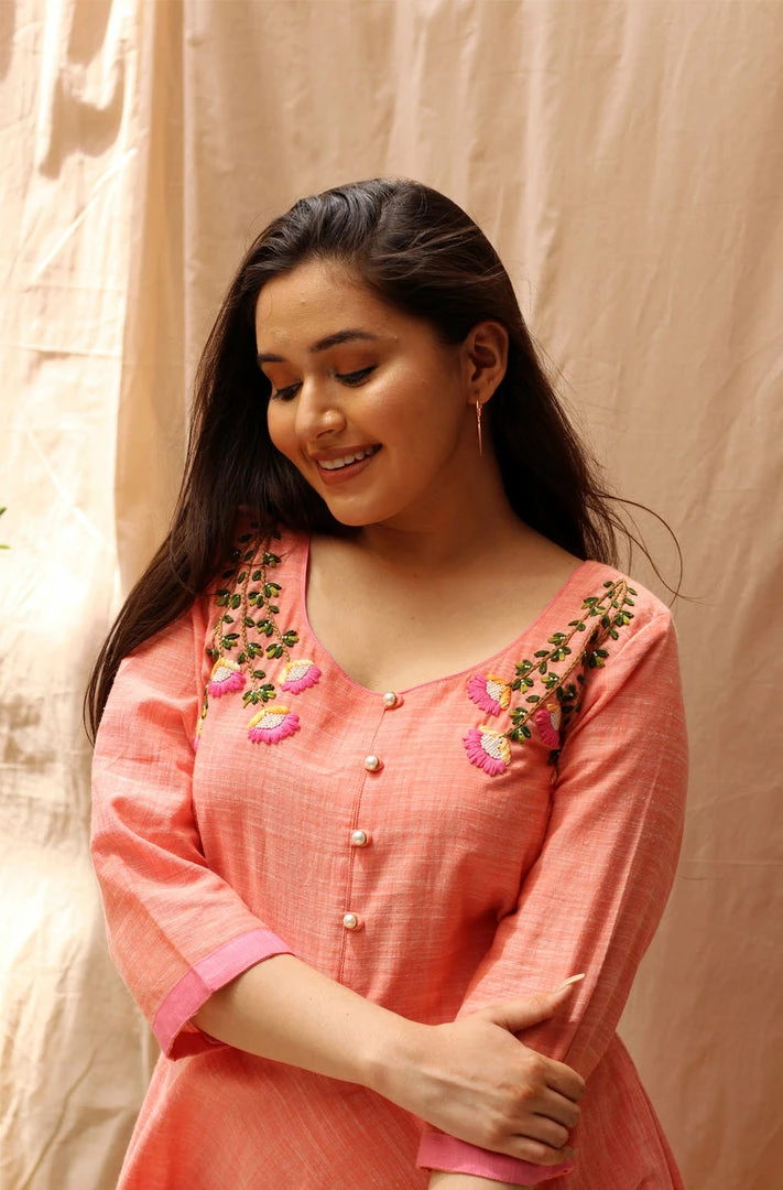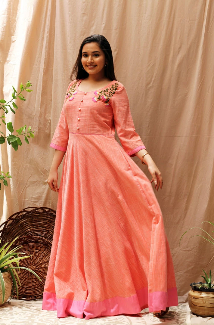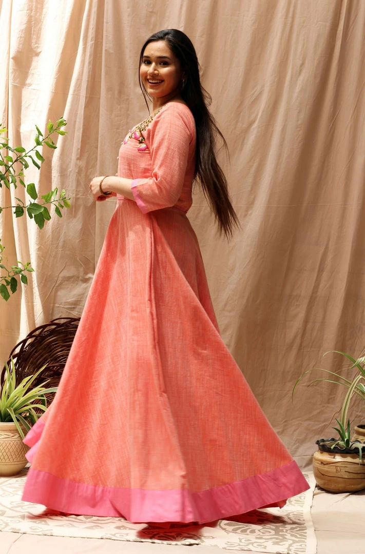 A full length dress in slub cotton with beautiful hand embroidery on the front, this dress is perfect for your evening soiree. It comes in a very fresh combination of peachish orange and bubblegum pink, and has an umbrella silhouette to suit all body types.