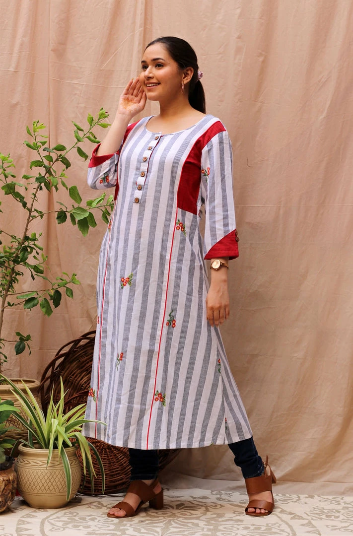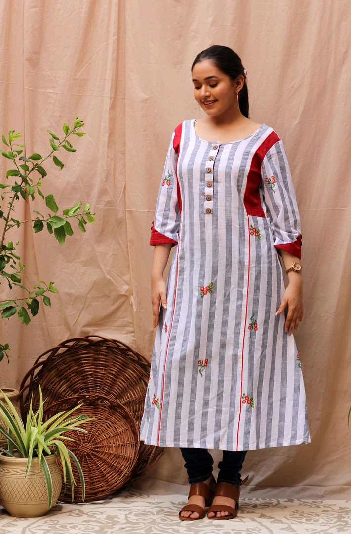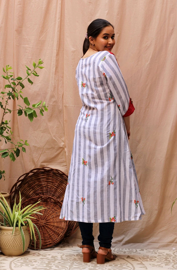An A-line kurta in white and accented with red. The kurta is striped in black and white and embroidered with red flowers all over.