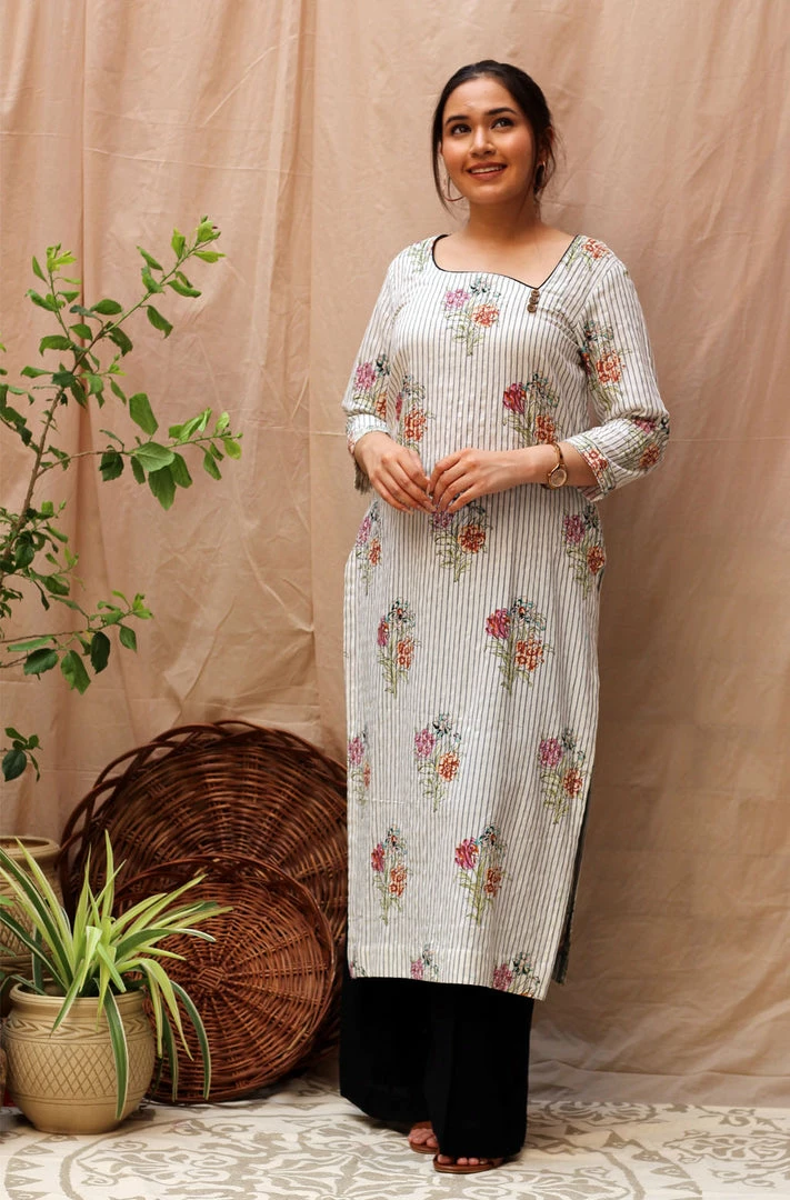 A black and white striped kurta with all over floral print paired with a black flared pant. The kurta comes in an asymmetrical neckline and classic wooden button details.