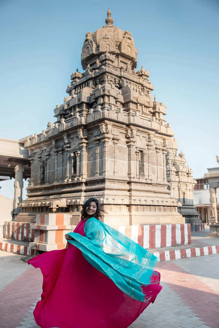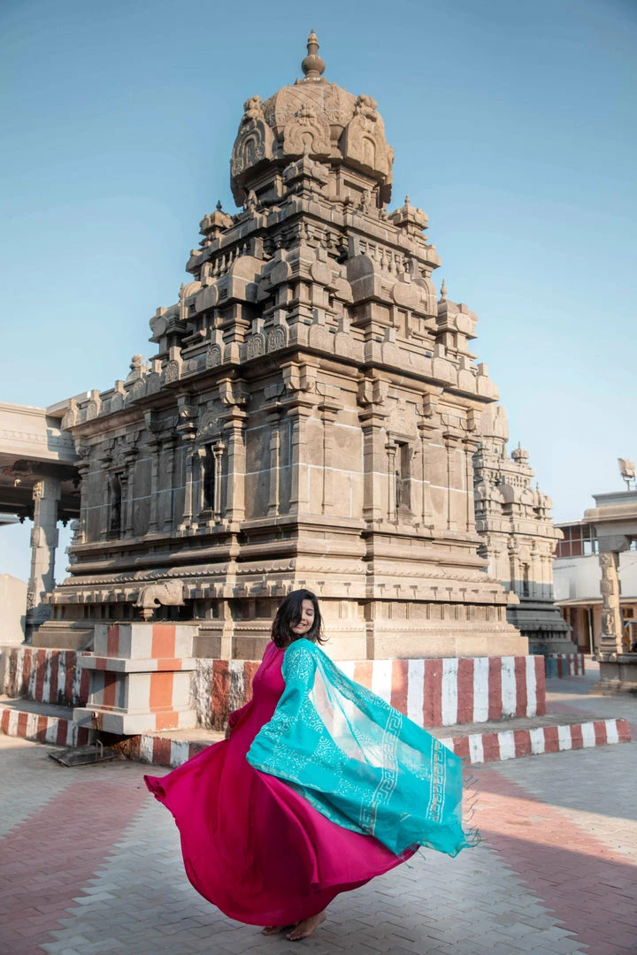 Bright pink flowy rayon in flattering fit-and-flare style with full gathered sleeves, patterned yoke and blue hand block printed chanderi cotton dupatta.