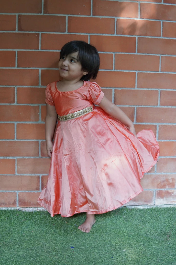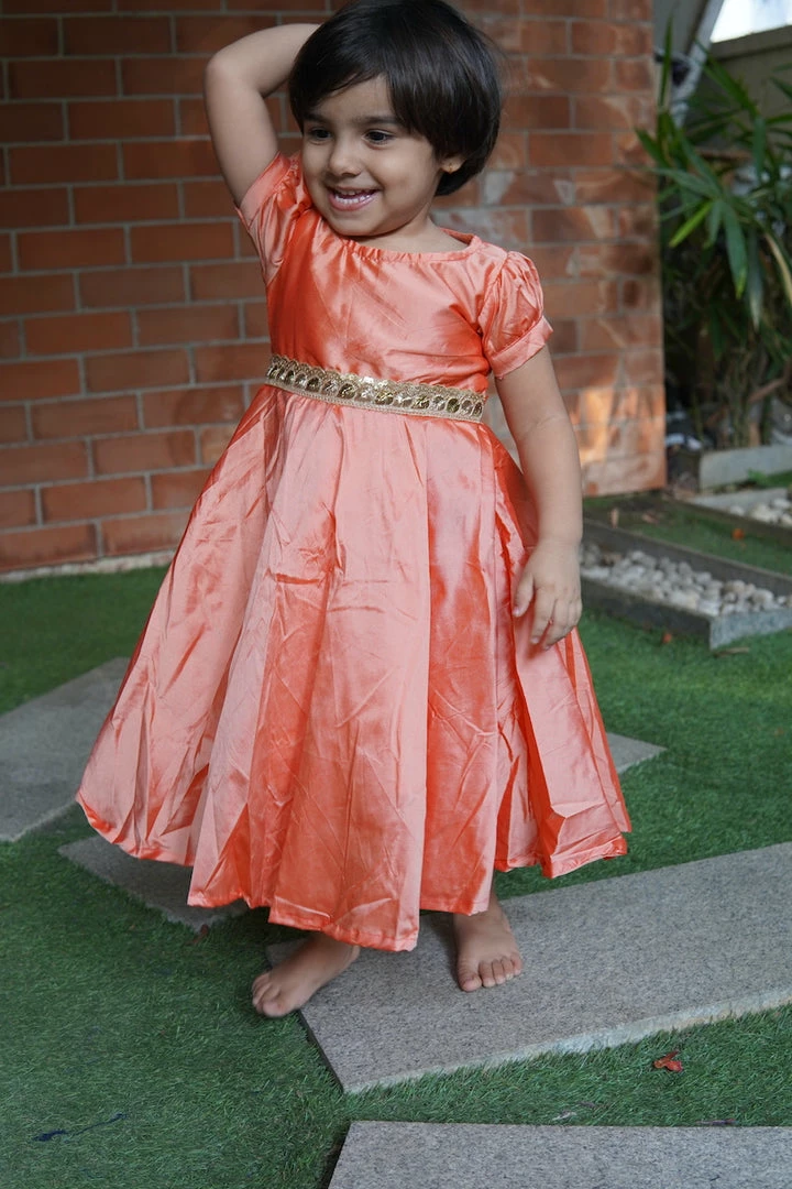 Peach silk frock with gold lace.