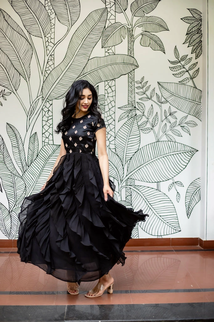 This flouncy, frilly ruffle dress in black is easy to style and totally wearable. Beautiful, light and soft – this outfit is perfect for your date night or cocktail party and is sure to make heads turn. Lining provided.
