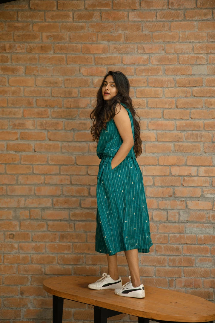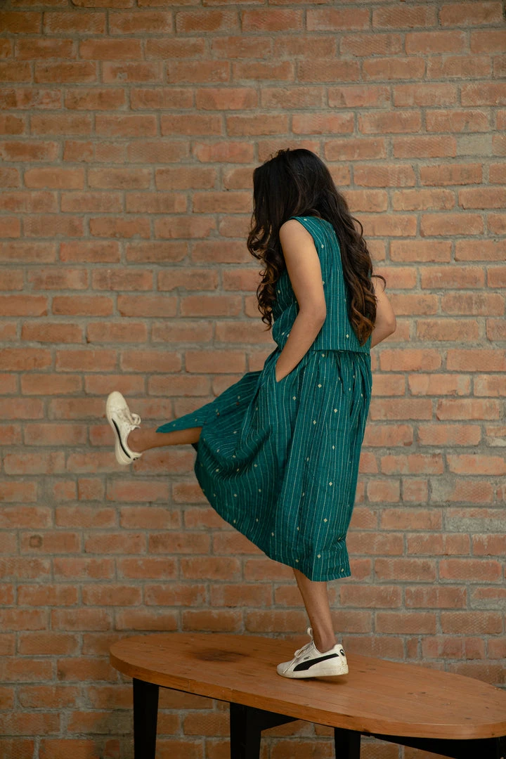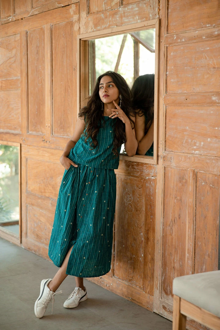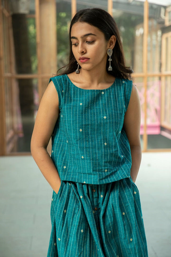 Teal handloom woven cotton sleeveless top and skirt set.A super comfortable ,smart and casual outfit.