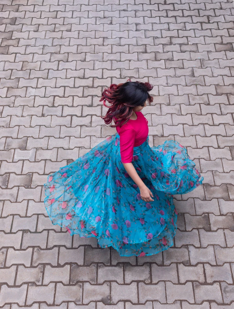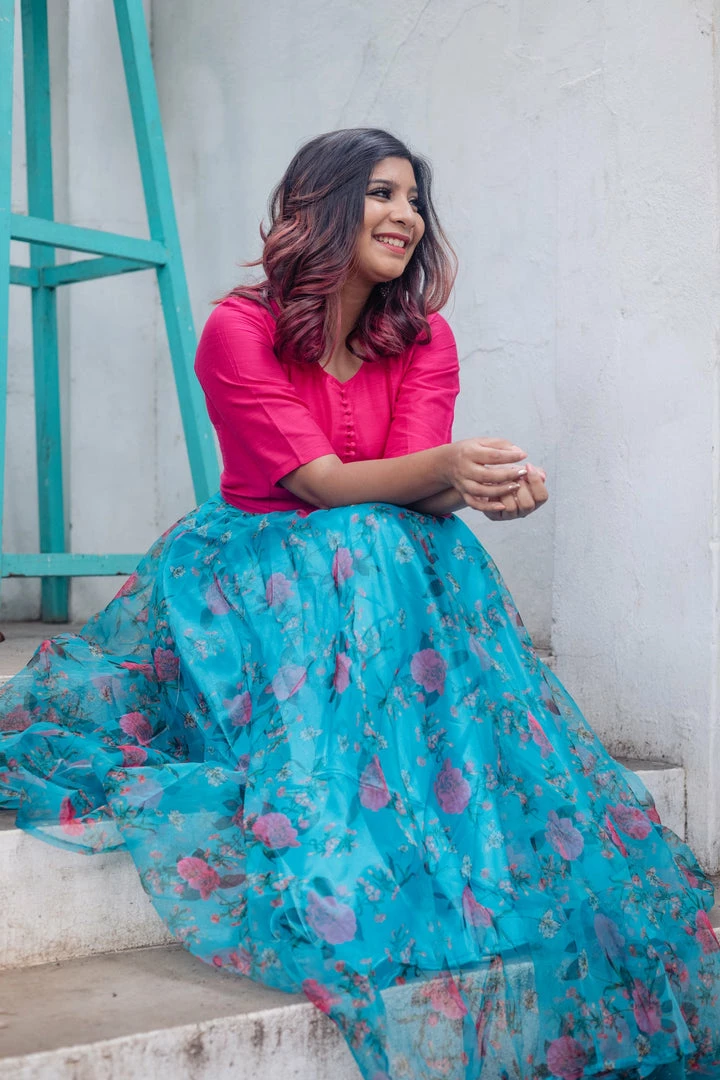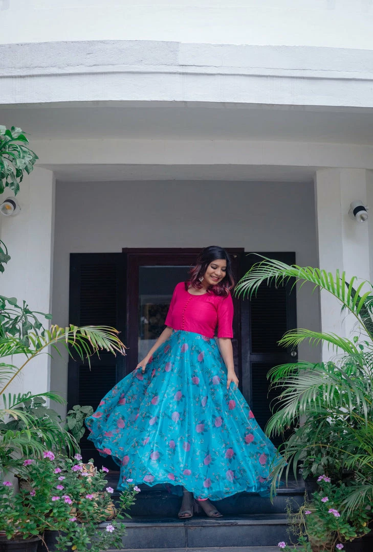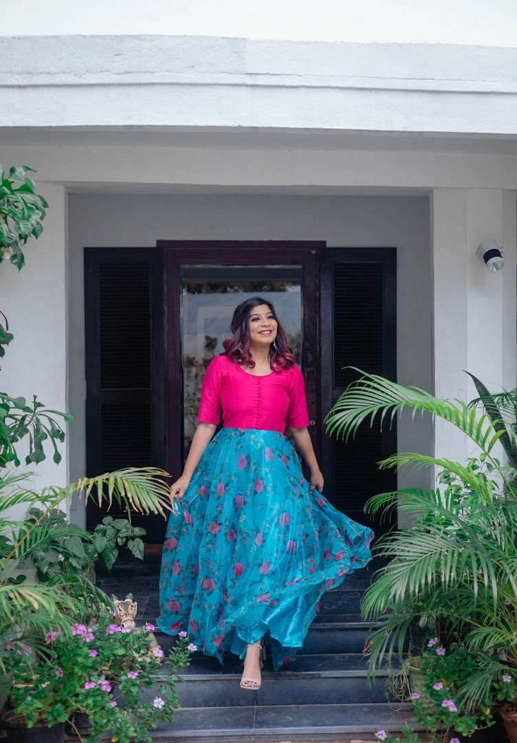 Fuchsia pink dupion silk yoke and beautiful blue floral flare with satin lining .A light and flowy all season outfit!