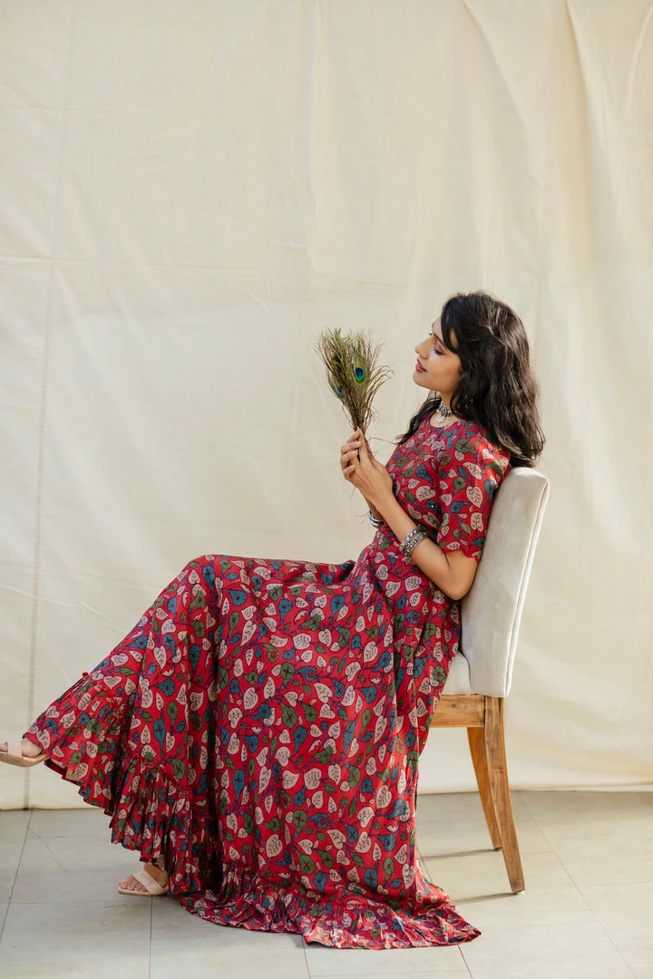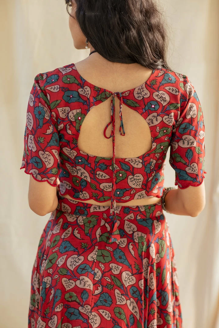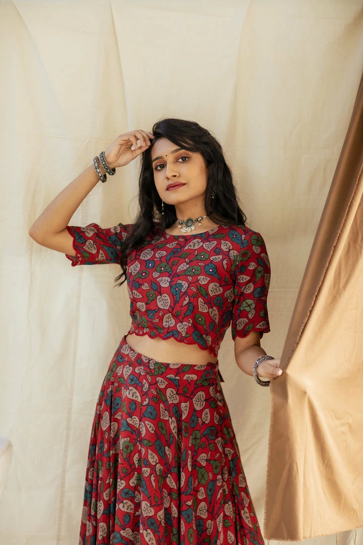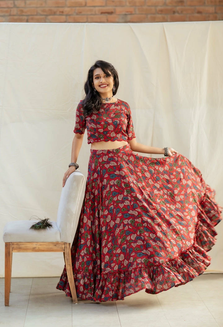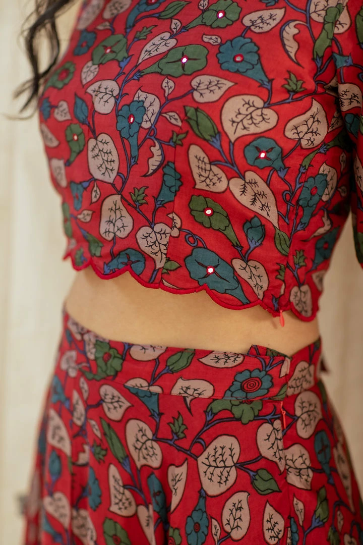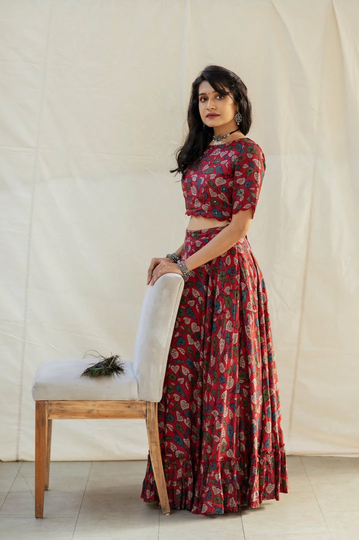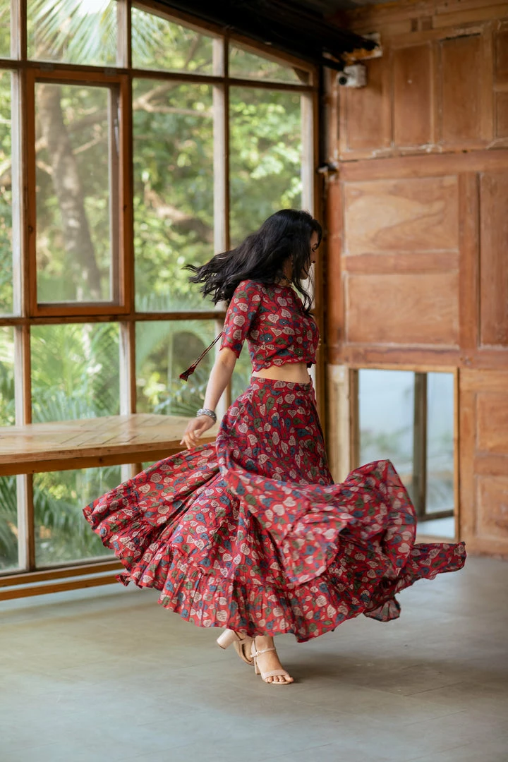 Dark red floral muslin silk crop top with embroidered mirror work and scallop detailing, paired with a flowing full circle ruffle border skirt. Beautiful, light and soft – this outfit is perfect for your festivities. Lining provided.