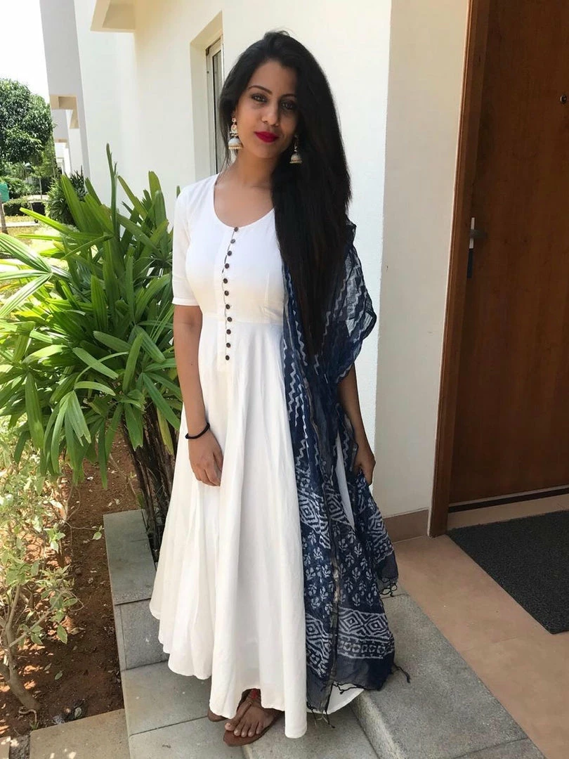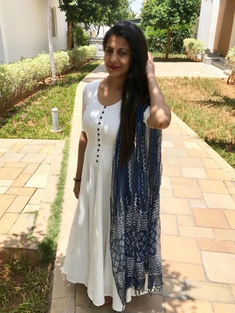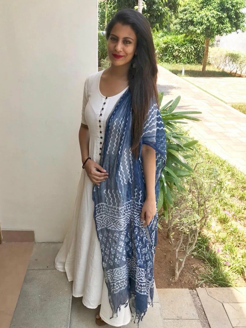 Fine cotton white fit-and-flare dress with Indigo Kota dupatta. Lining provided.