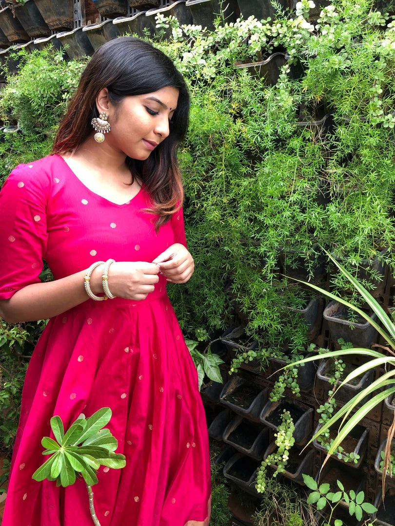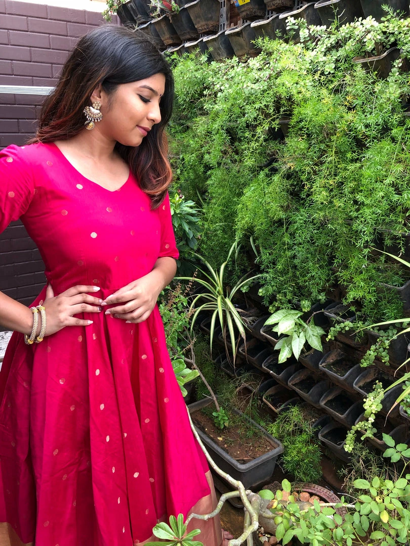Two-tone magenta pink dupion silk fabric with gold butta all over and a big tissue border in classic fit-and-flare silhouette. A must-have this festive season! Lining provided.