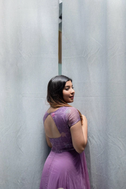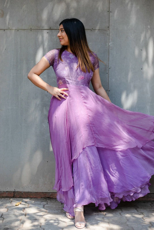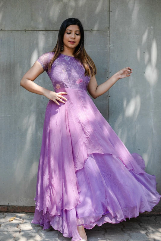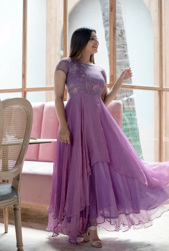 Pretty Lavender double layered flowy georgette fit and flare dress with floral kota yoke. Lining provided