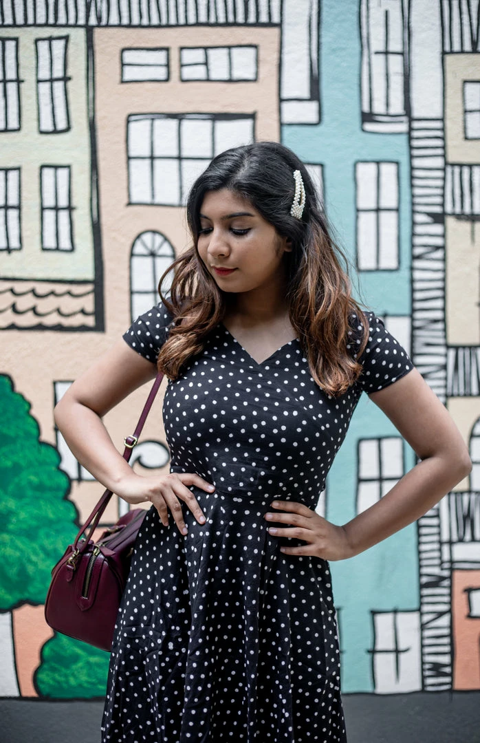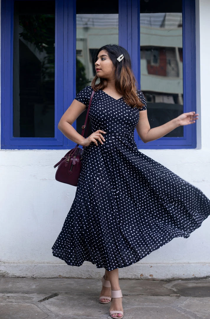 Black fine cotton hand block printed polkadot midi dress with angrakha style yoke and tie-up. Dress has concealed zipper on back.