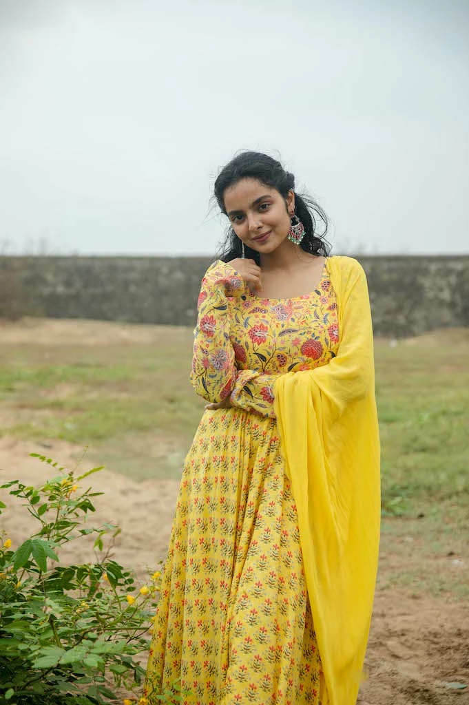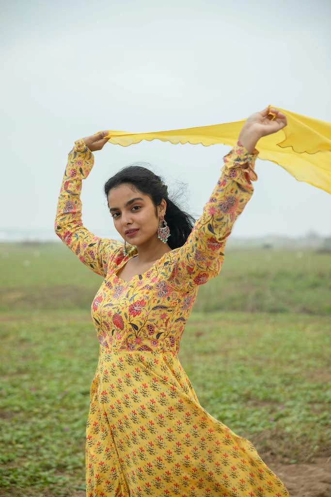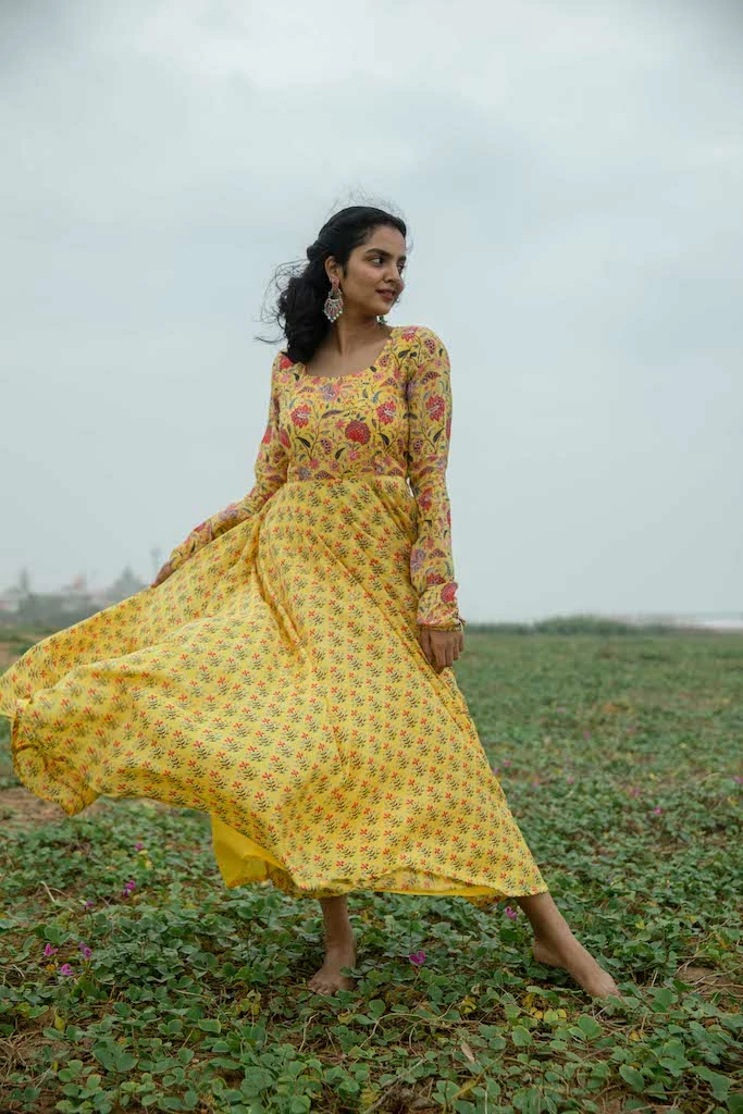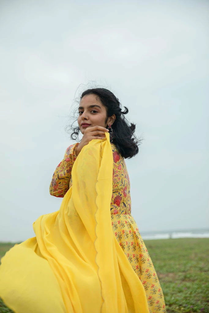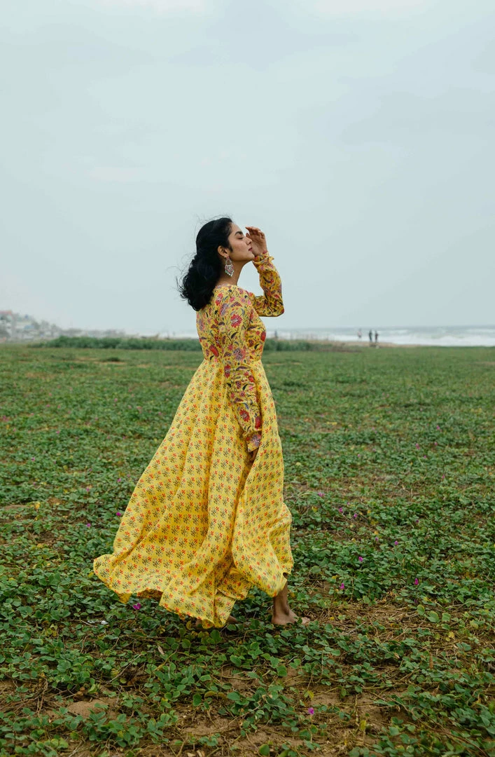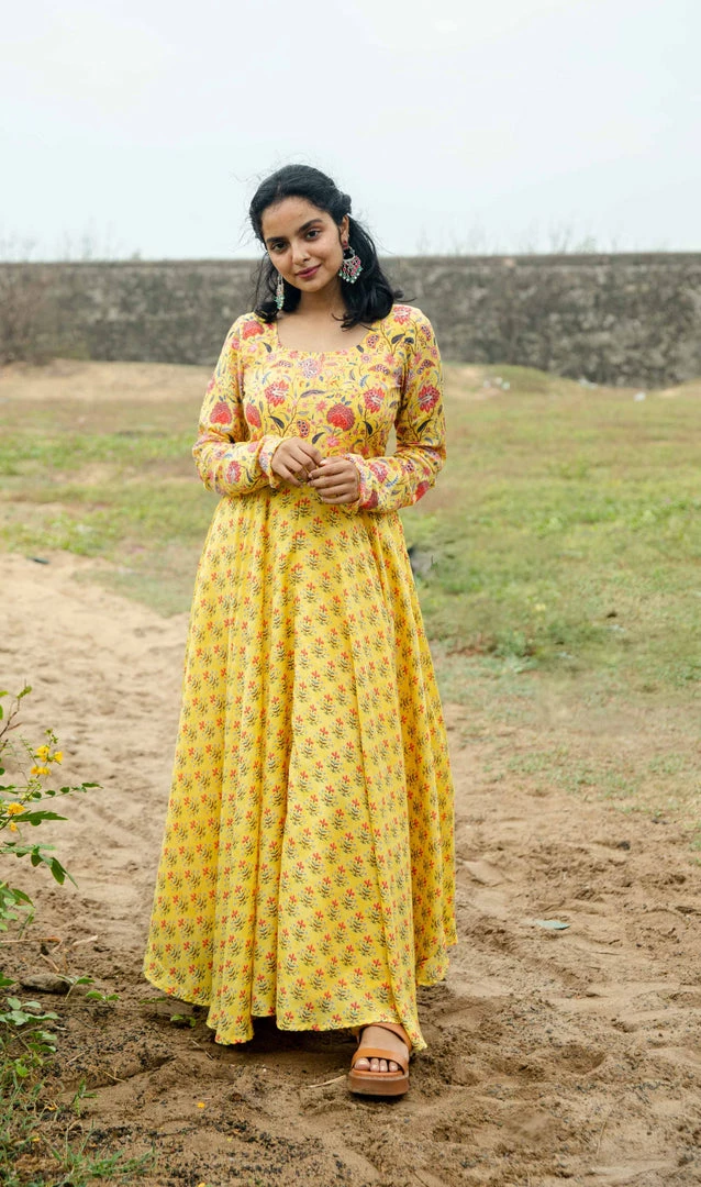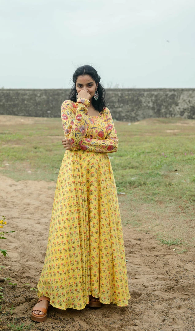 Beautiful yellow print – on- print floral muslin silk fit and flare dress and georgette dupatta with golden scallop detail.A light and flows all season outfit!lLining provided.