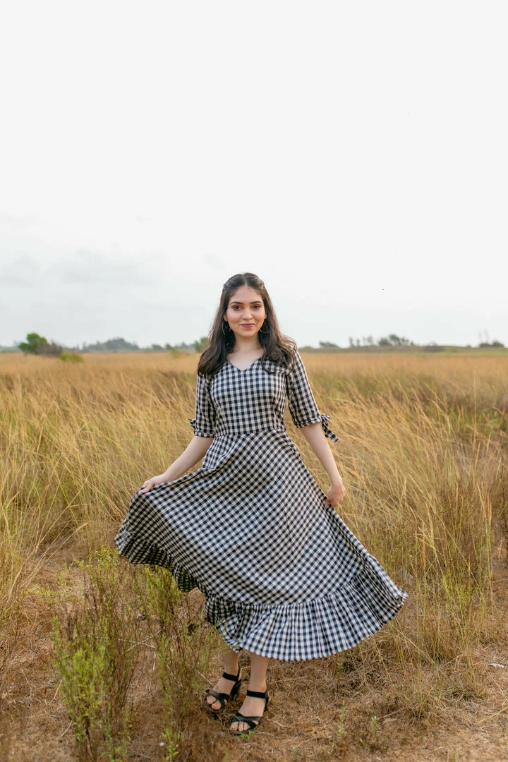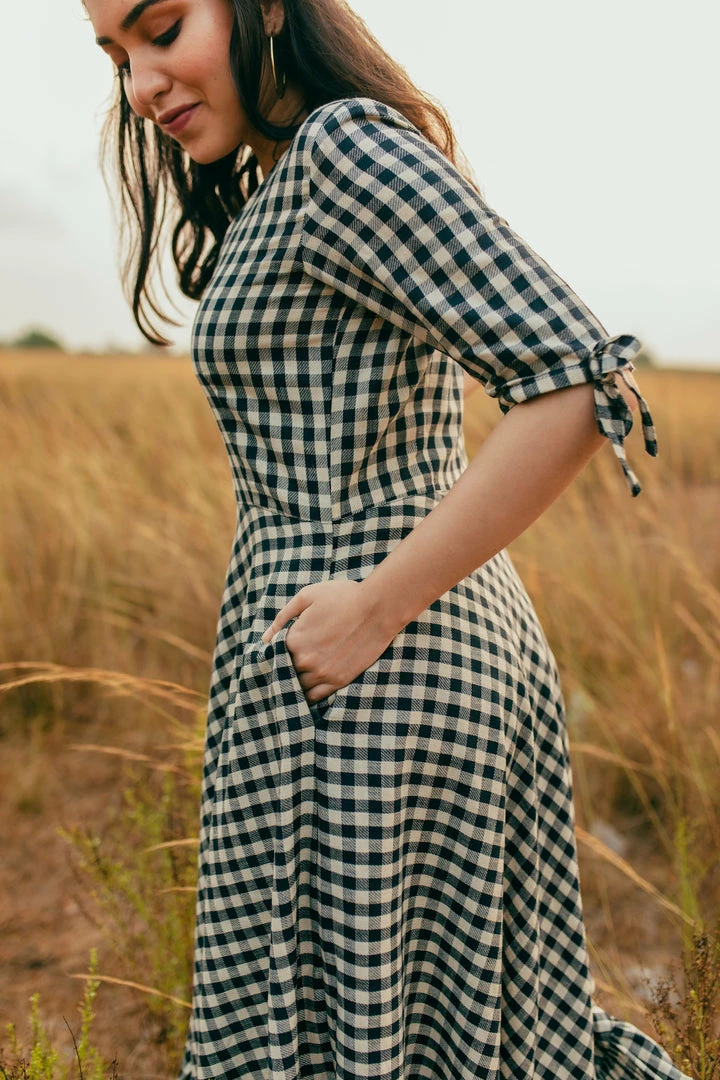 Easy-chic black gingham dress that can be styled effortlessly all season long. With ruffles and tie-up sleeve details, this dress is a must-have!