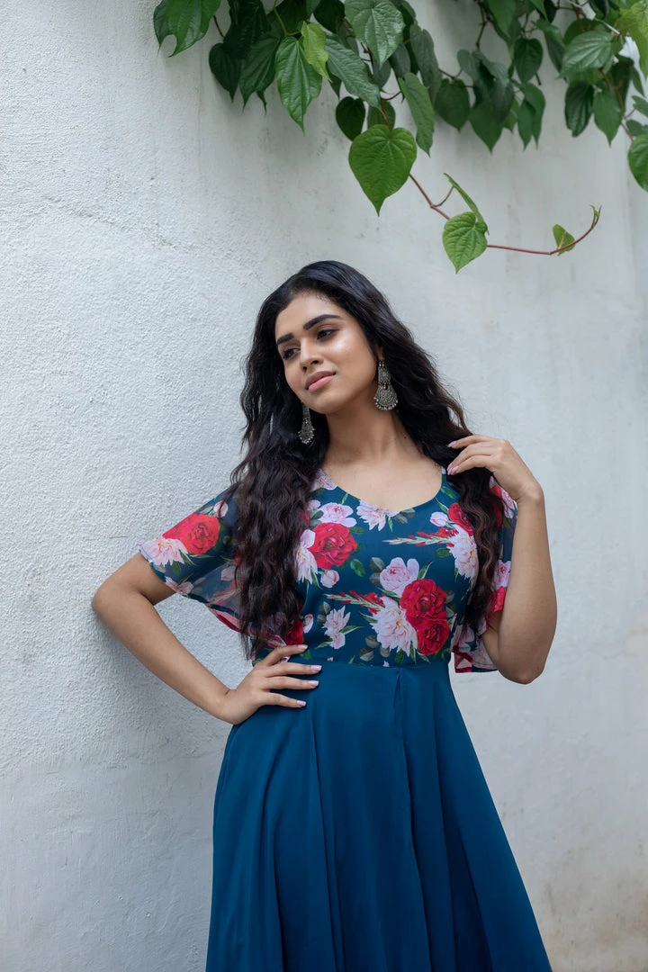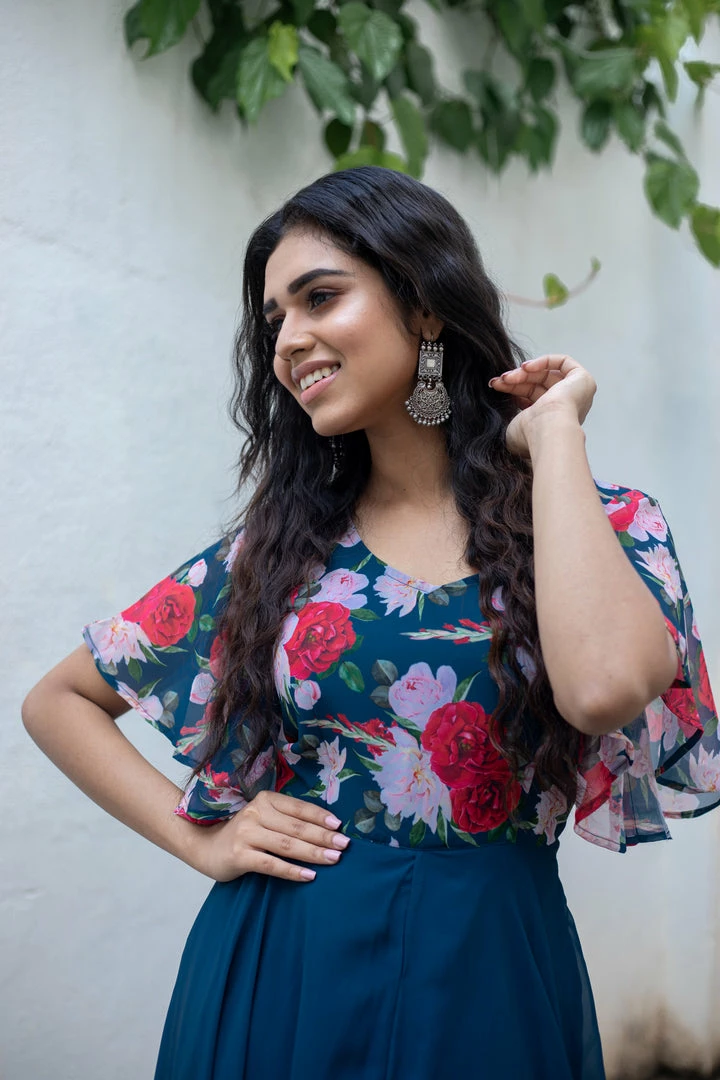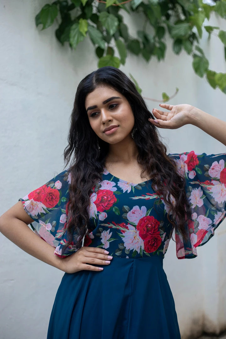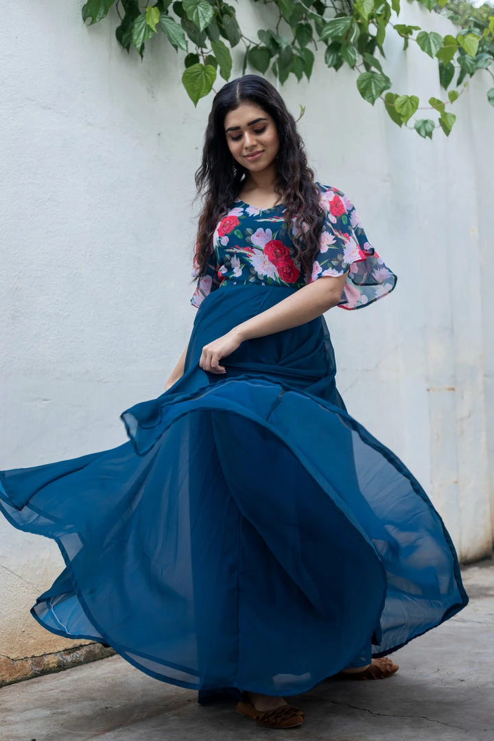 Light and flowy teal fit-and-flare Georgette dress with digital print floral yoke and pretty flutter sleeves. One of the best things about flutter sleeves is that they are flattering on all body types because their width balances the figure. A must-have!