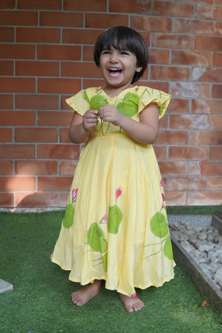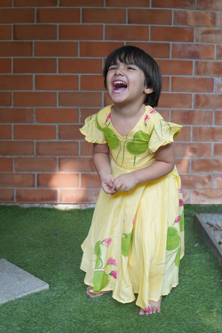 Flowy arabic brush painted Fabric in a happy yellow with ruffle sleeve.Â