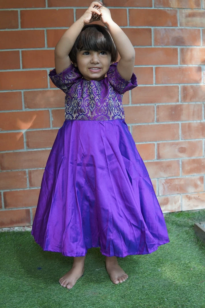 Brocade silk yoke with semi silk flare, mini puff sleeve detail.