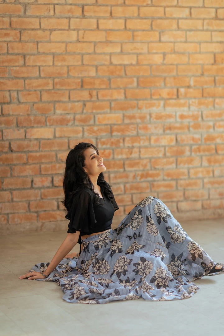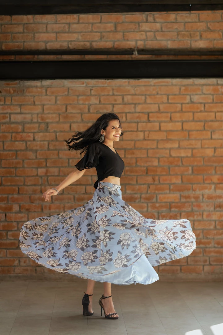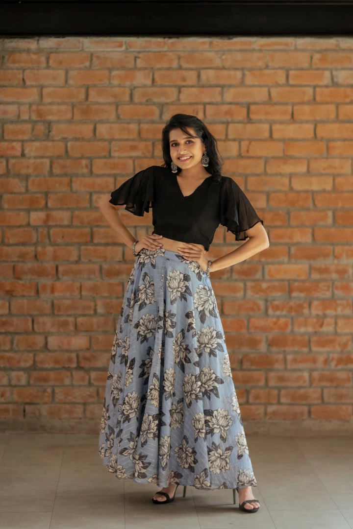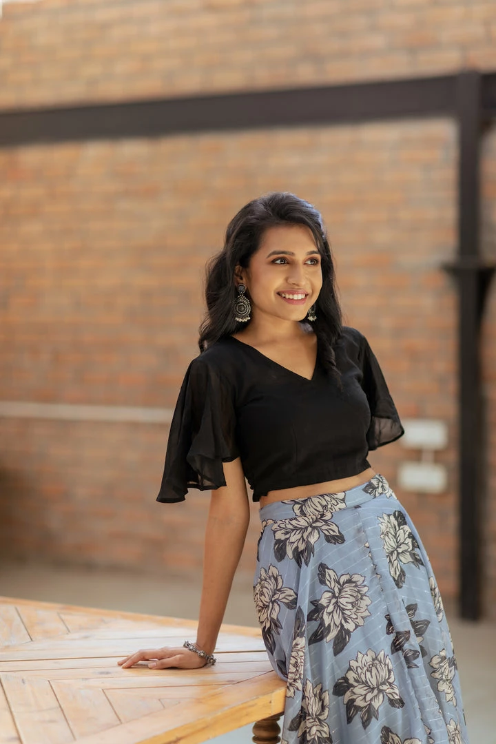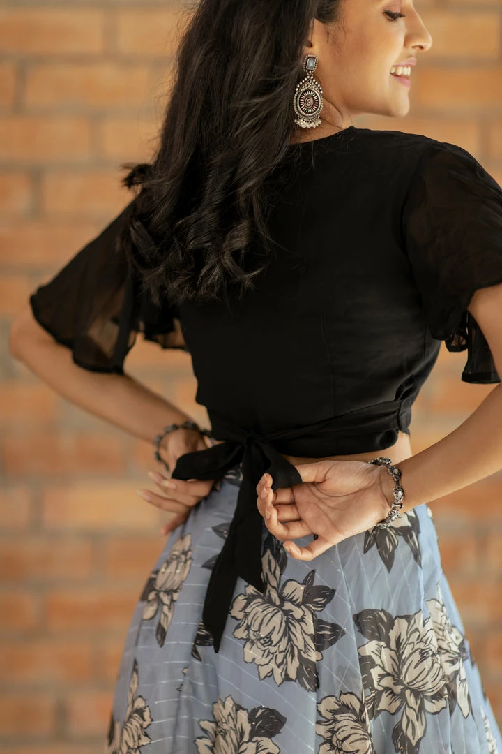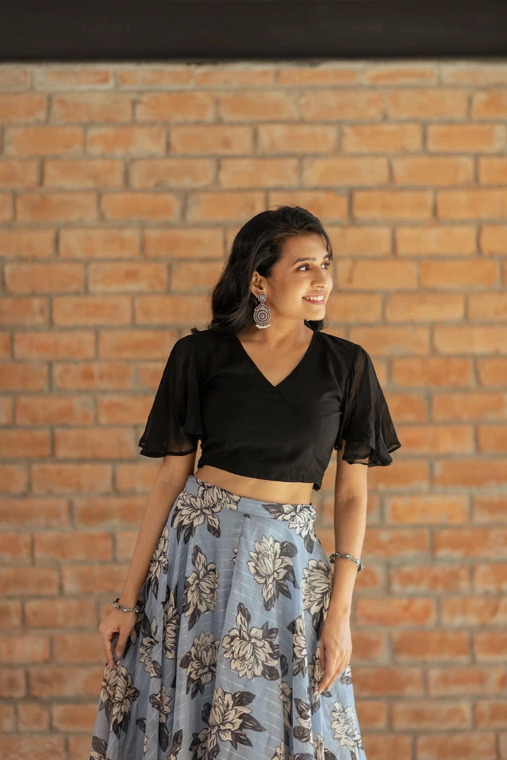 Black georgette angrakha crop top with flutter sleeves and flowing full circle floral embroidered organza skirt. Beautiful, light and soft – this simple yet chic outfit is perfect for your festivities. Lining provided.