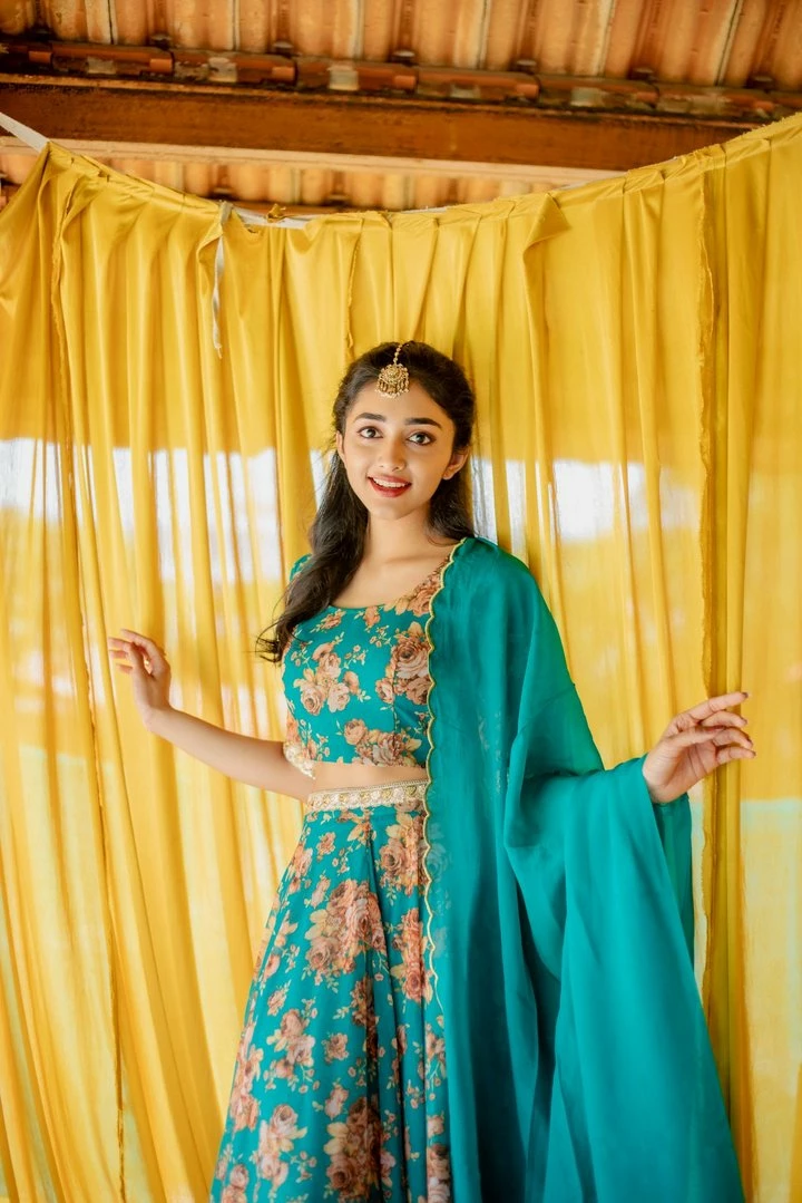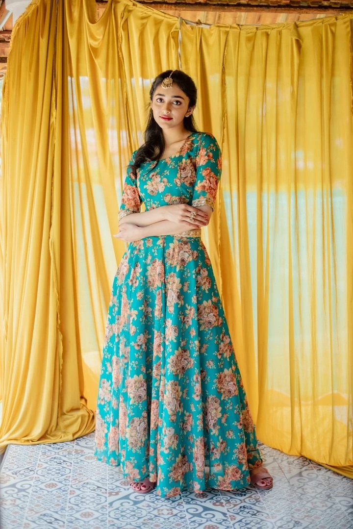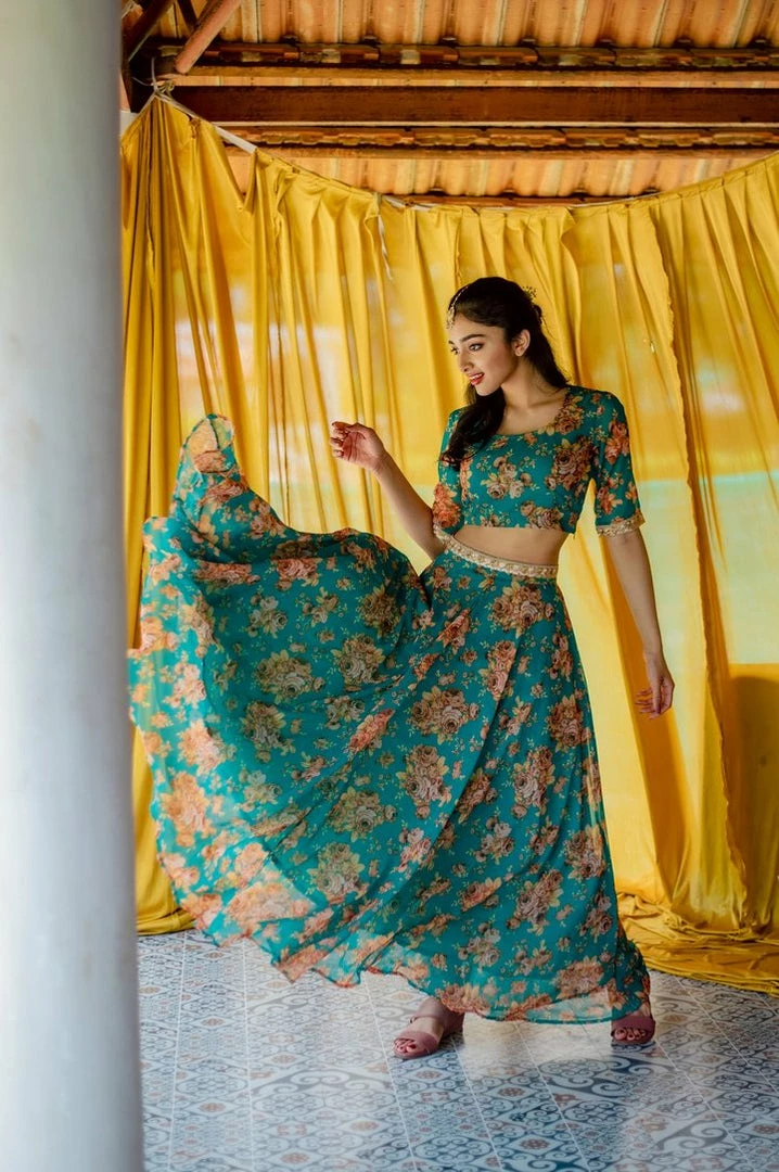 Pretty floral georgette sea green crop top and full circle skirt with gold lace detail along the waistline. A perfect outfit for your mehendi/sangeet. Includes matching organza dupatta with gold scallop to complete the look. Lining provided.