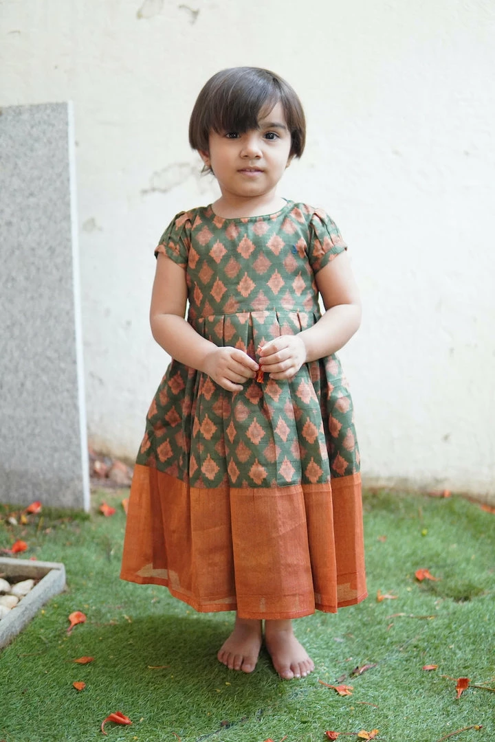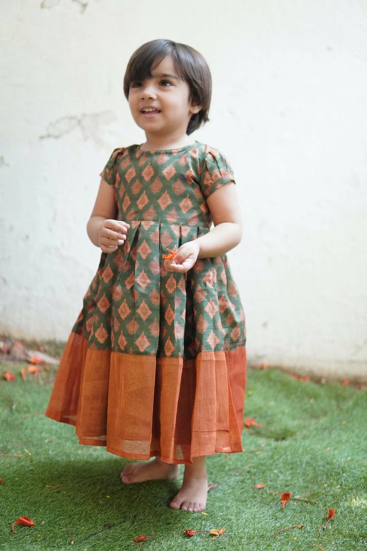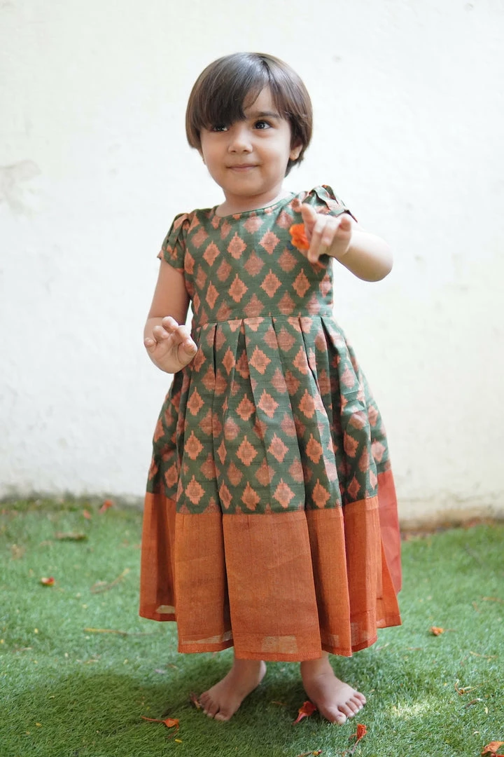 Ikat silk frock with tissue border and mini puff sleevesÂ