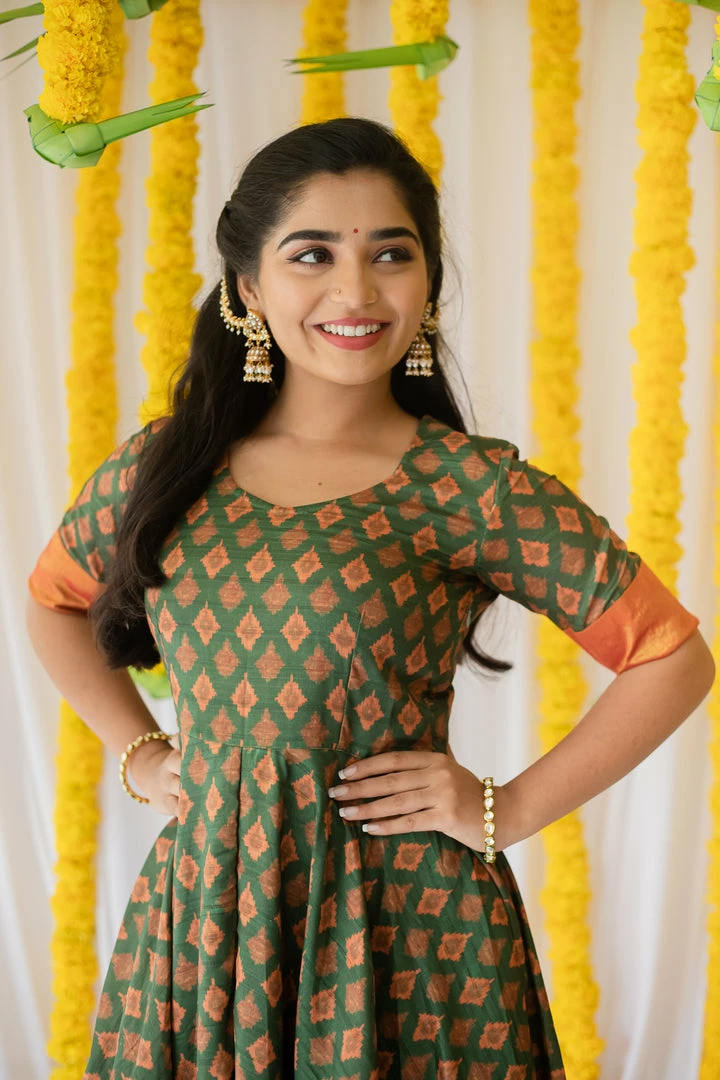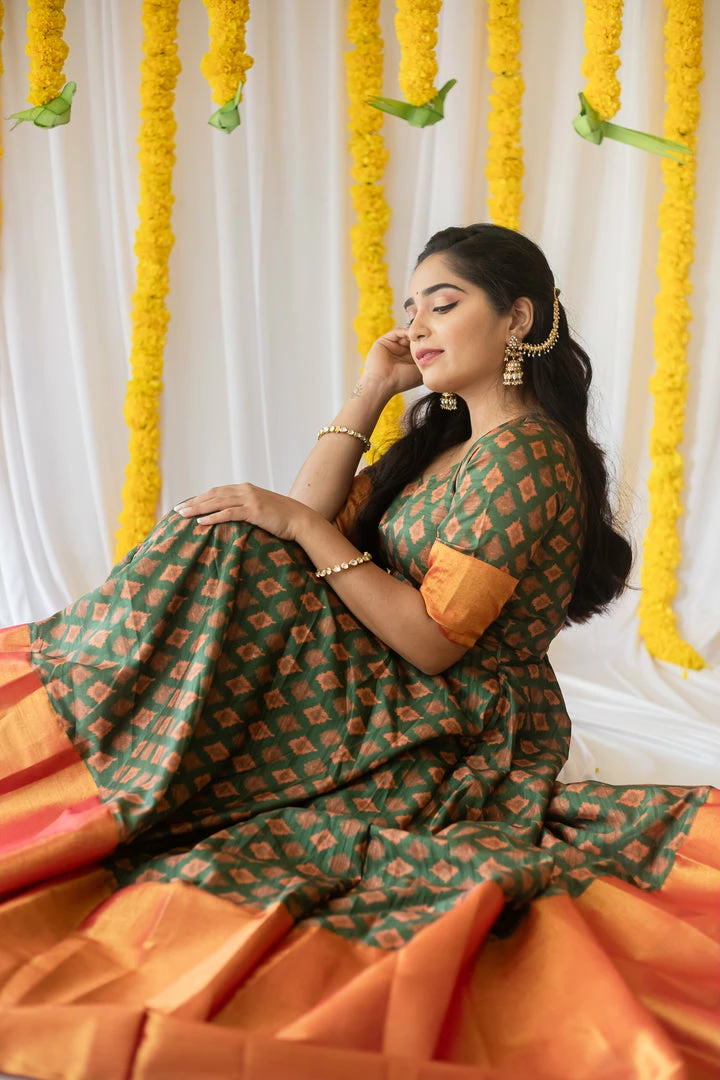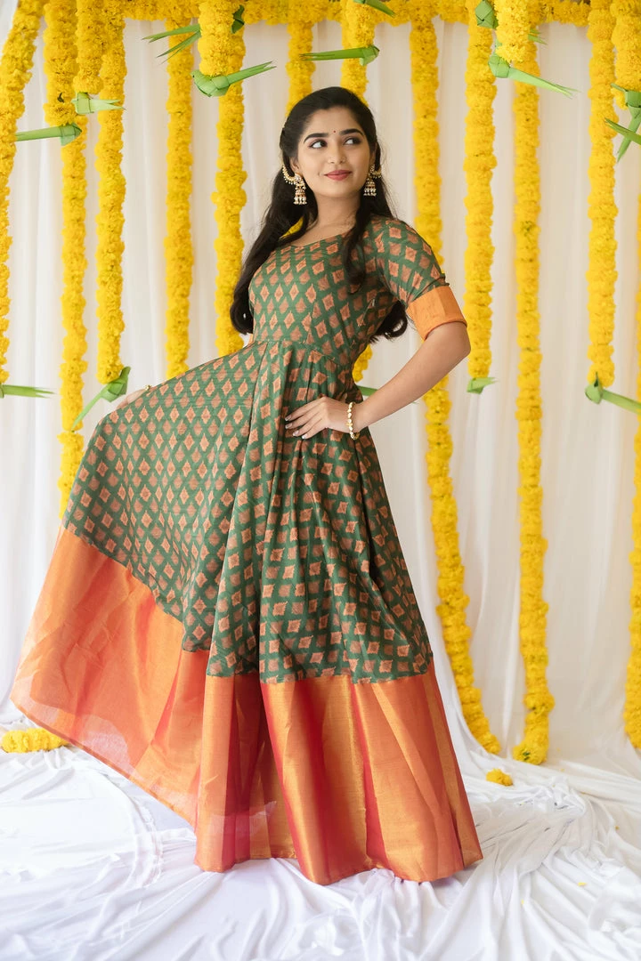 Soft semi tussar silk Ikat dress with a beautiful tissue border. Made in the flattering fit-and-flare silhouette, this dress is perfect for your festivities and can be worn all season long. Lining included.