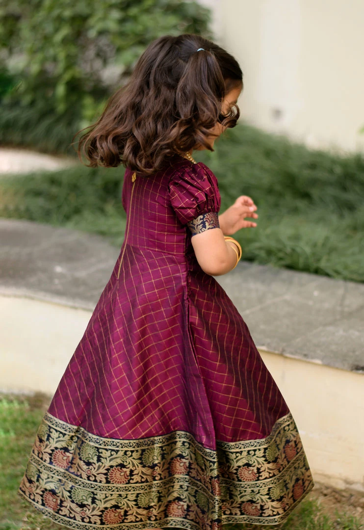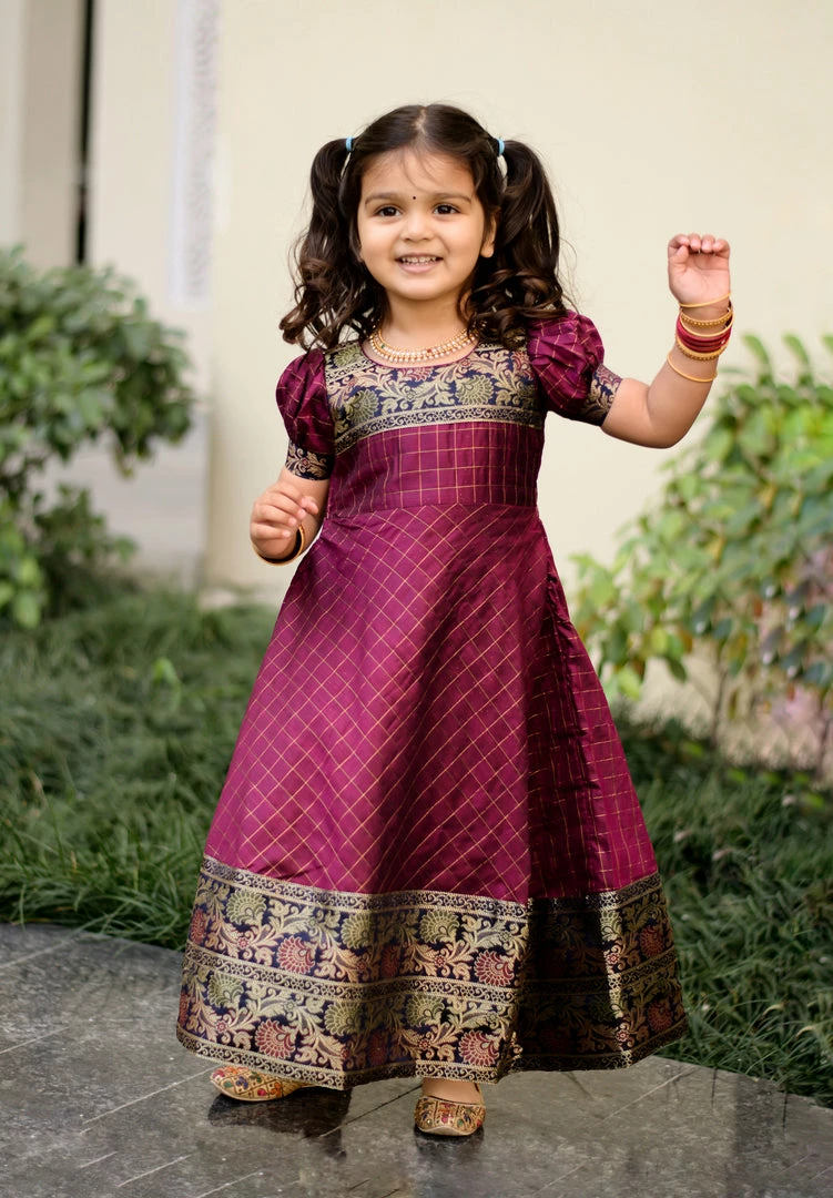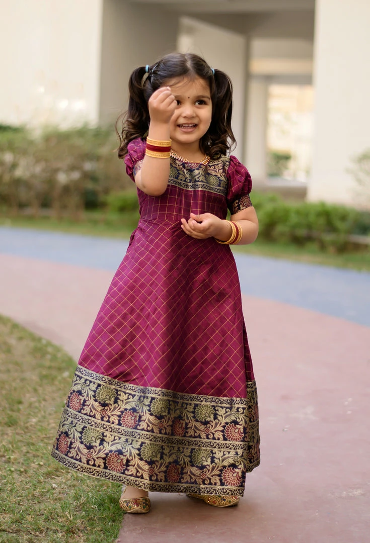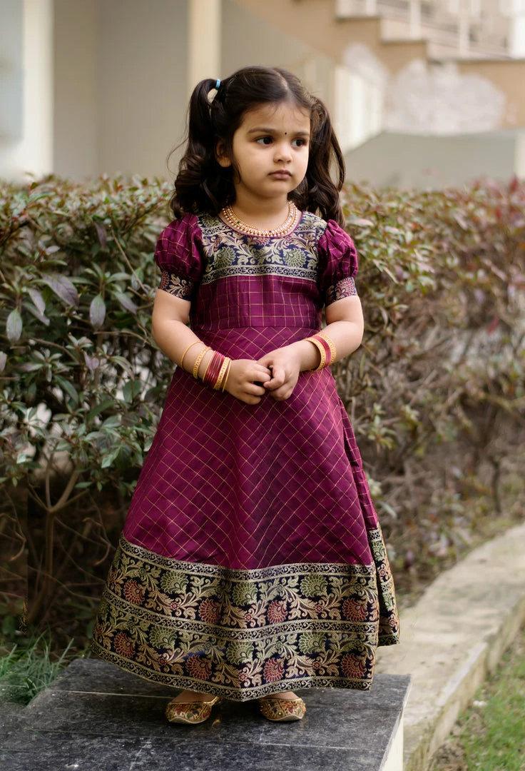 Chanderi cotton silk dress with zari checks is embellished with zari borders in the hemline. And the puff sleeve detailing brings the traditional vibes. A super comfortable dress for the little angel. The dress is fully lined with cotton lining.