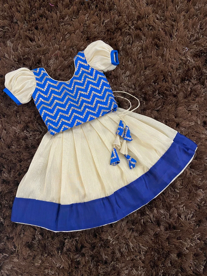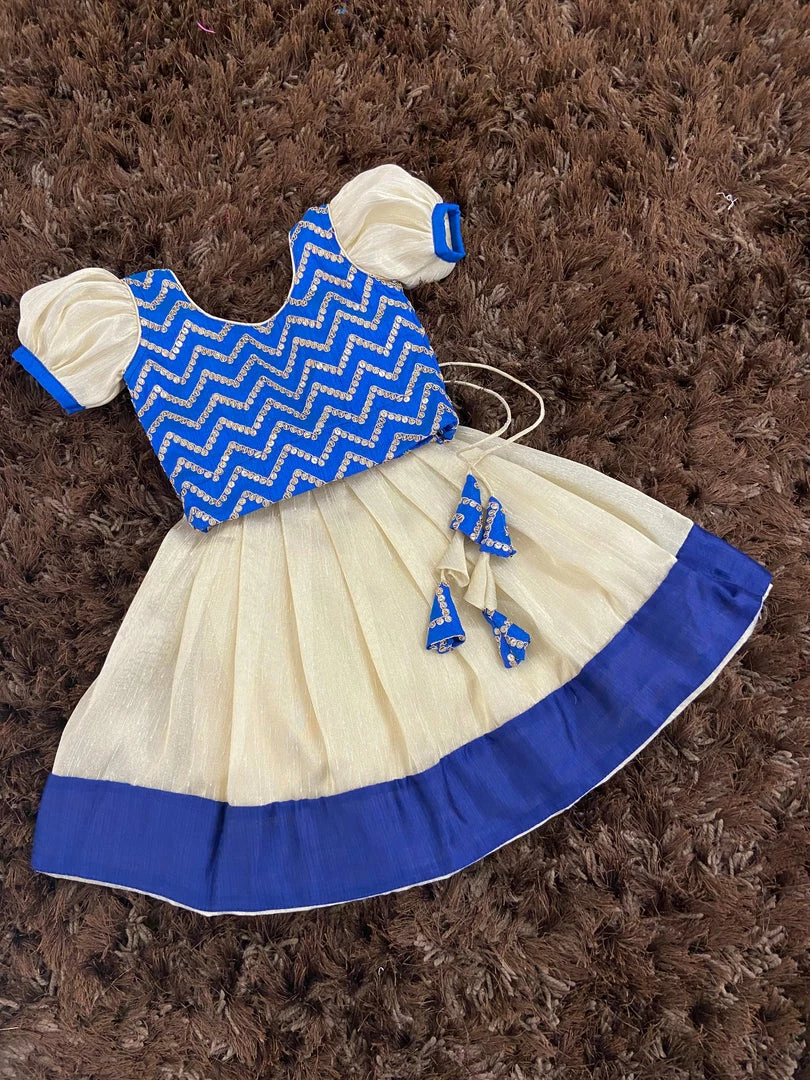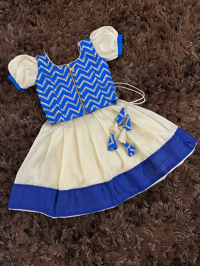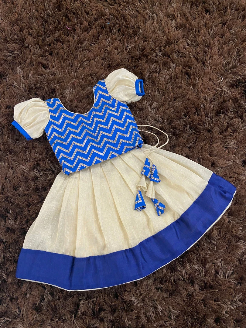 Tissue Silk skirt with embroidery embellishments in the top and the puff sleeve detailing brings the traditional vibes. A super comfortable dress for the little angel. The dress is fully lined with cotton lining. Back Metallic zipper closure.