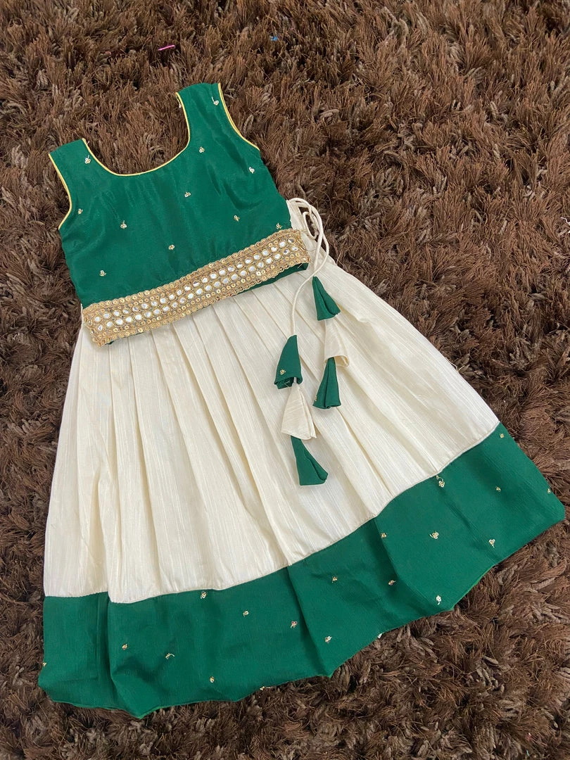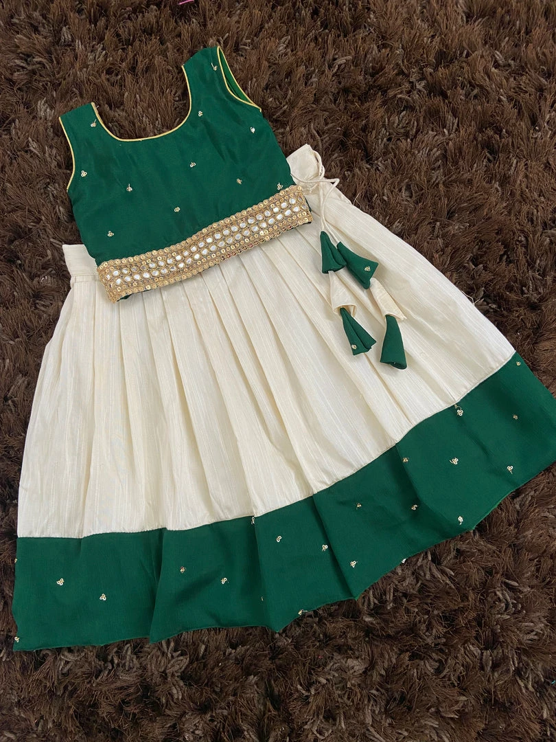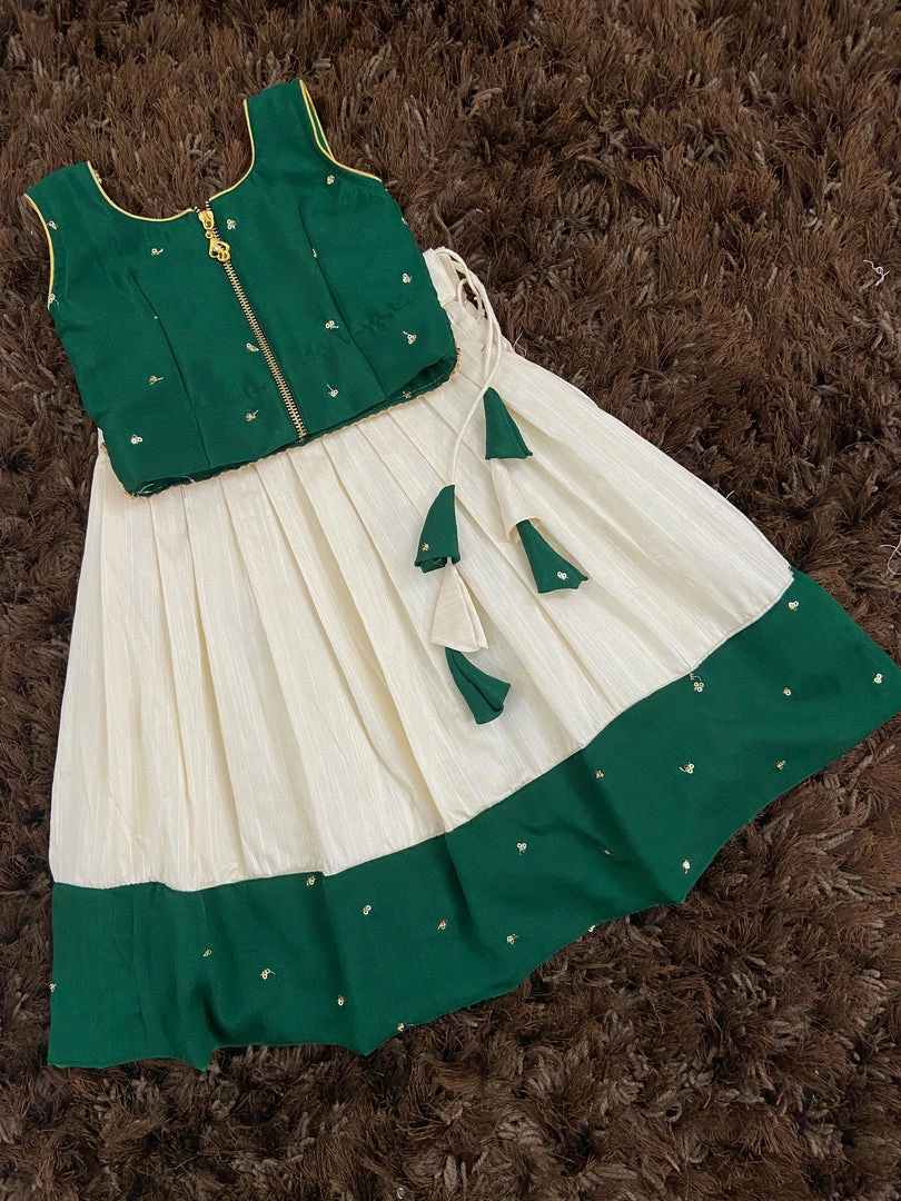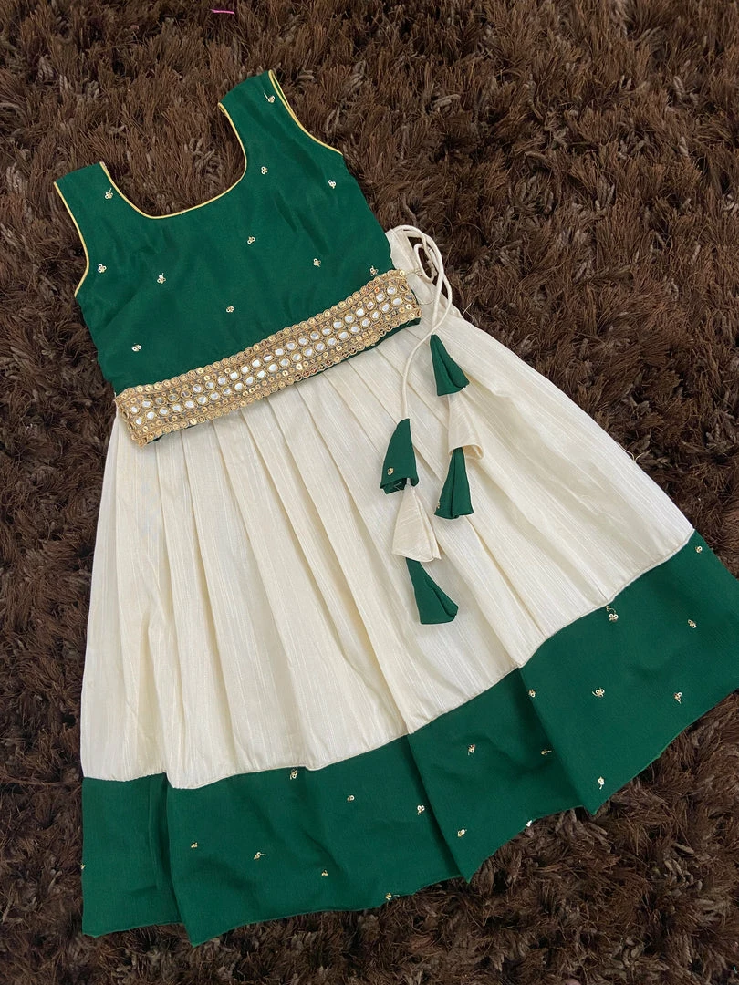 Chanderi Slub silk skirt with contrast silk georgette sequins embroidery top. This piece is a perfect comfort wear for this festive season. So soft on the skin that your little doll will love! Back Metallic zipper closure.