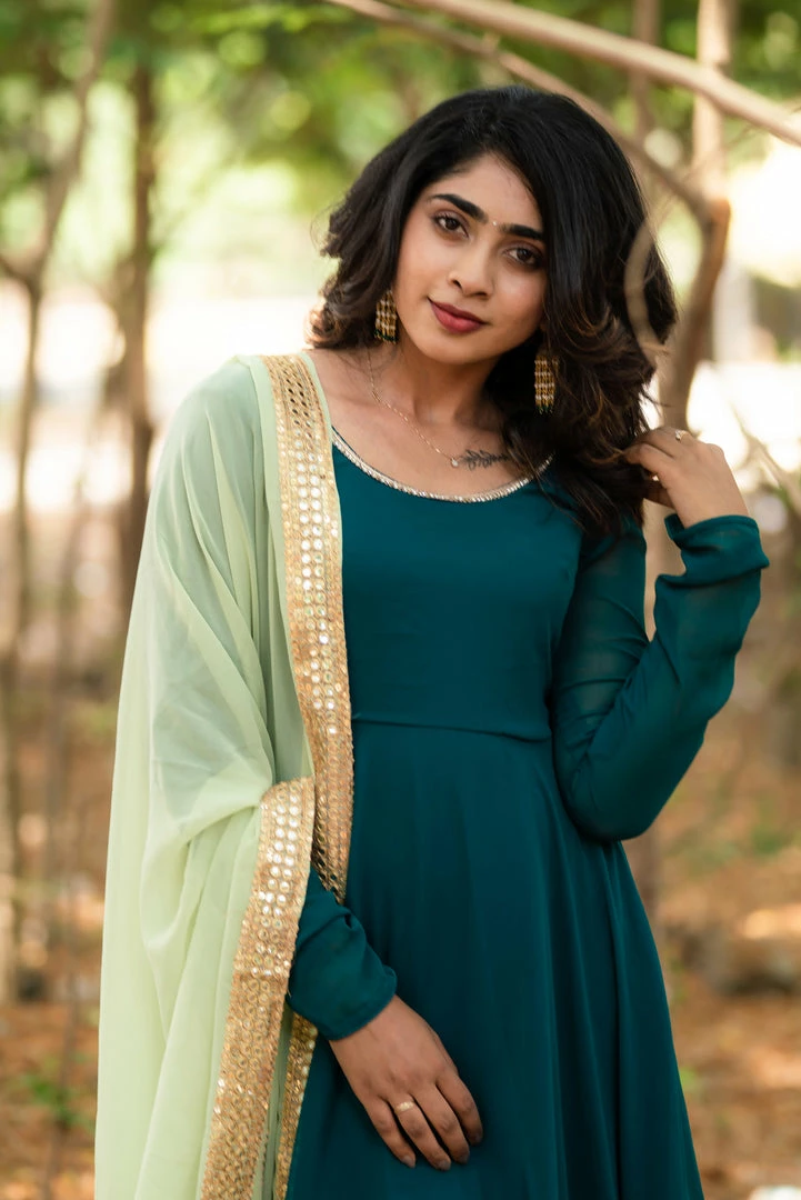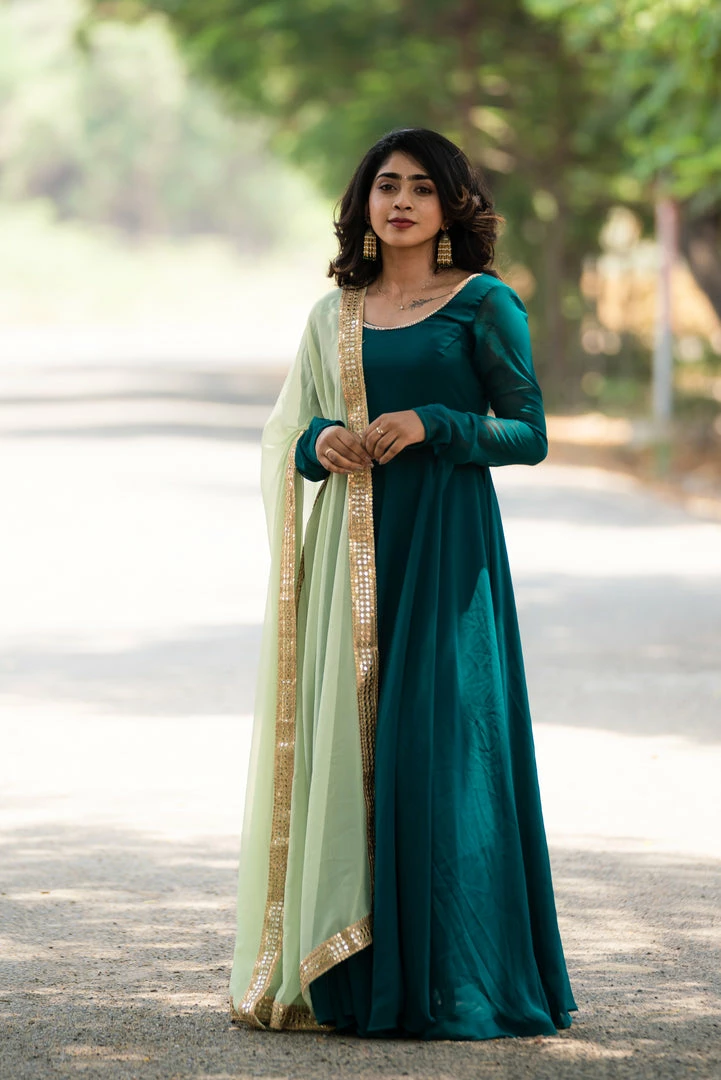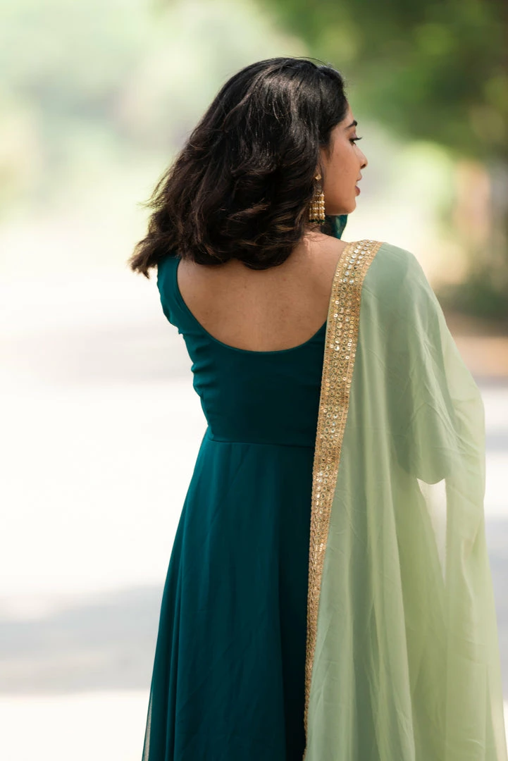 Look brighter than the sunshine in our Isha green maxi with light green dupatta with zari borders to add a little glam. This green maxi dress with light green dupatta ornated with gold zari border is a must have in your wardrobe!