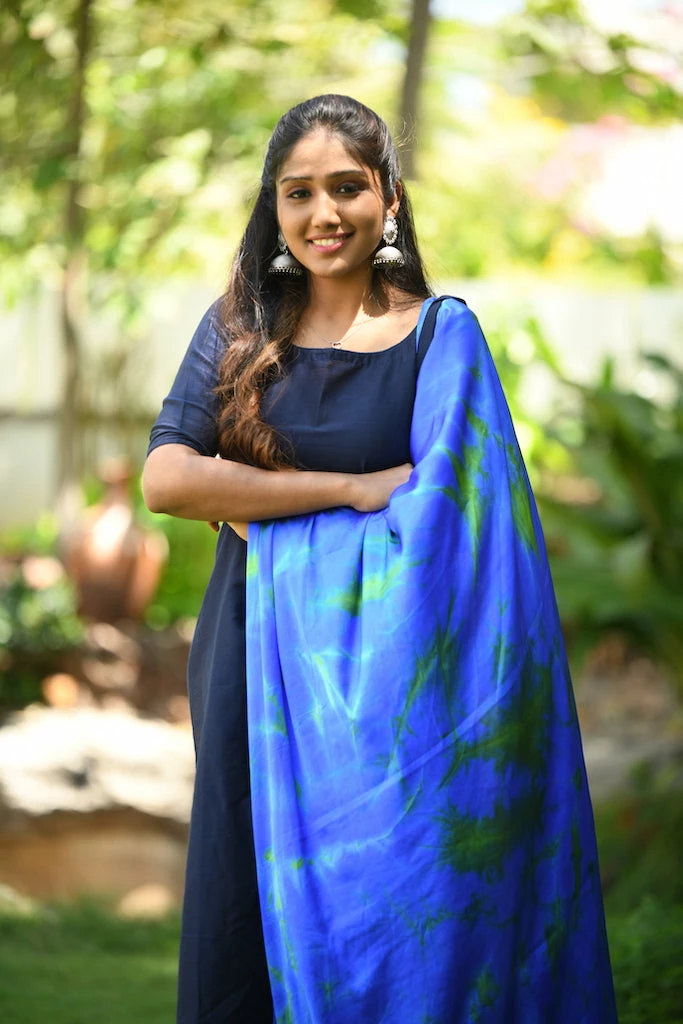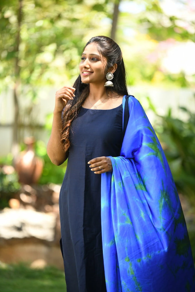 Summers are a great season to invest in cotton kurthis for your wardrobe. This classy blue kurthi with a dashing blue & green shibori dupatta makes for an excellent addition. Pair up with a silver earings and you are ready!