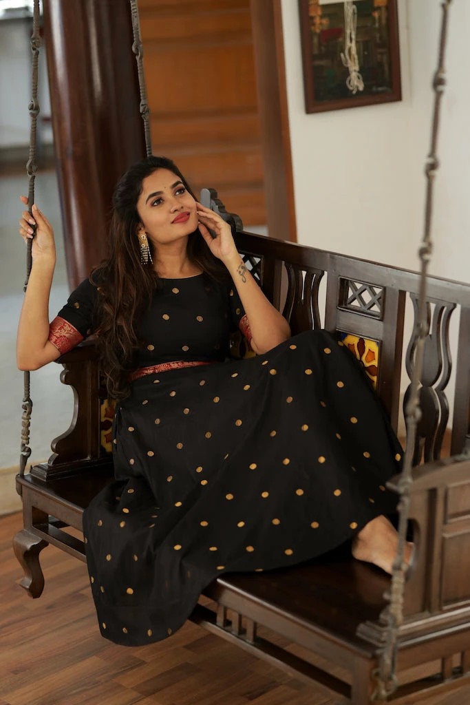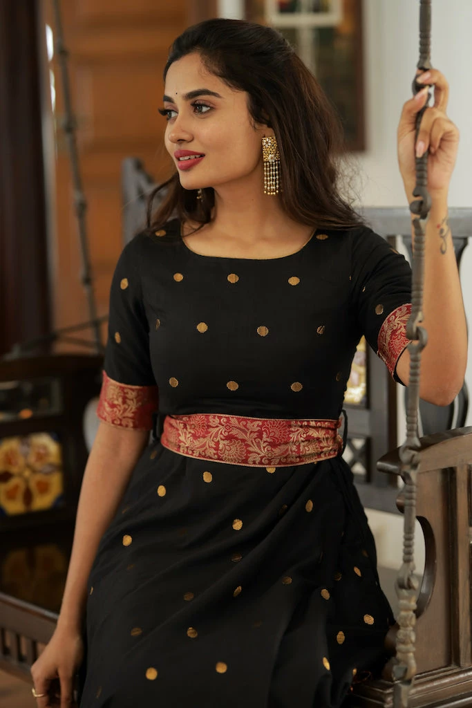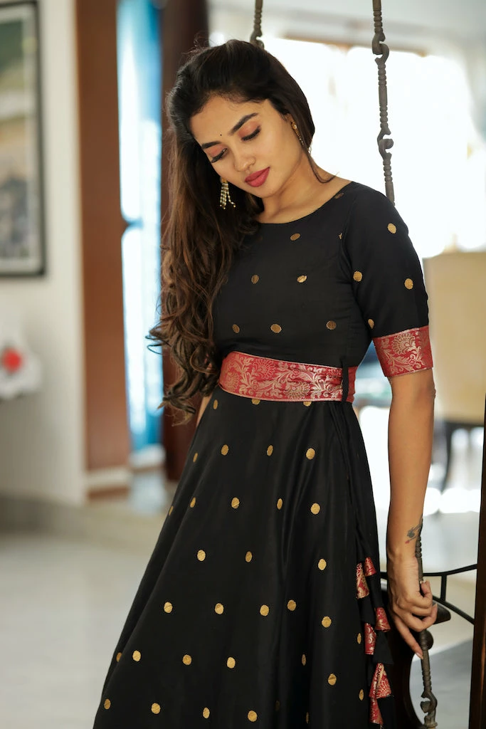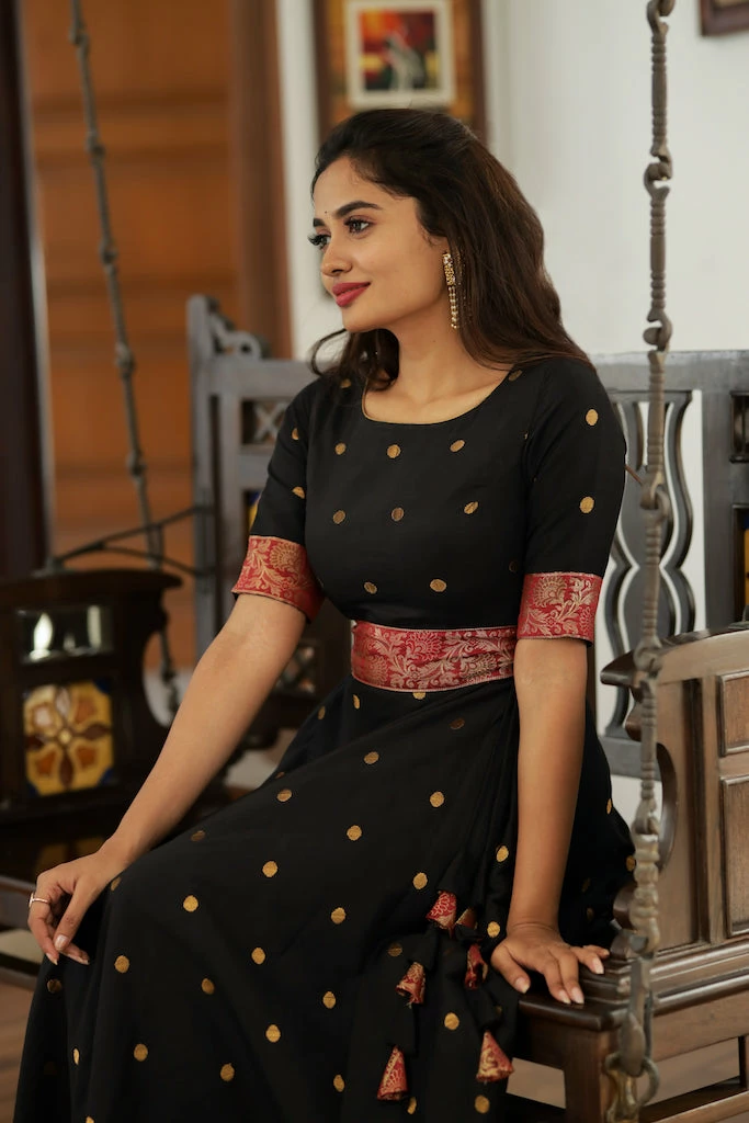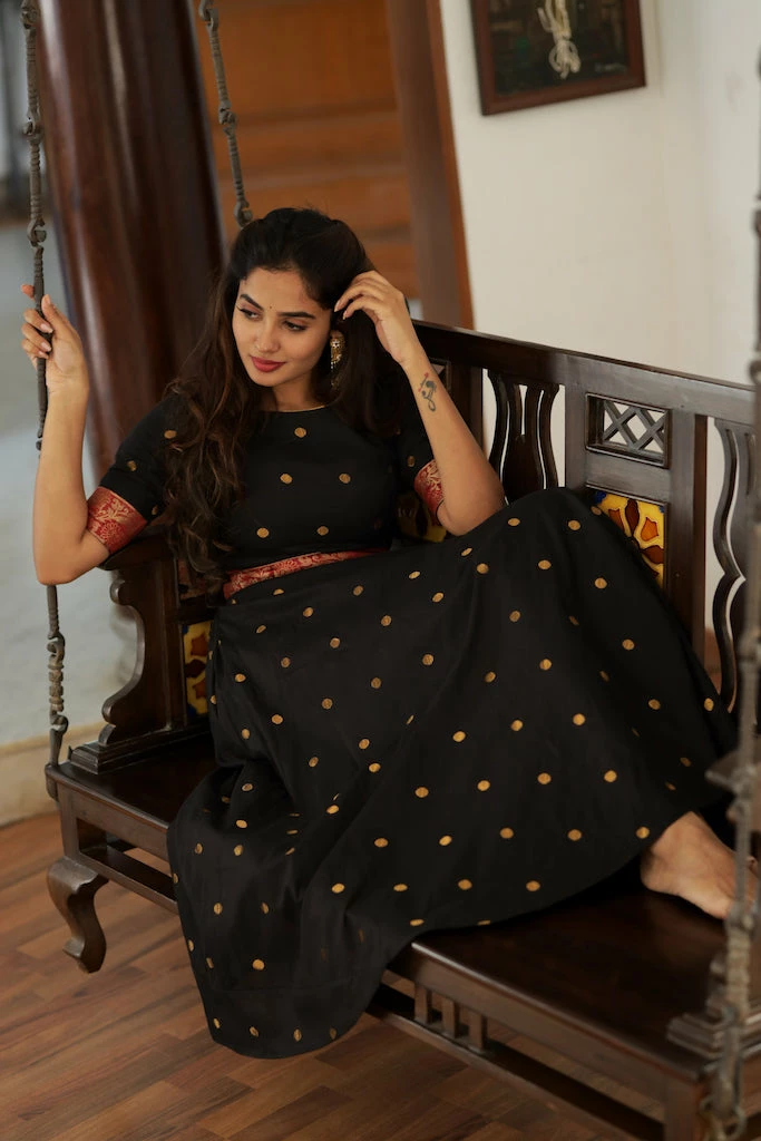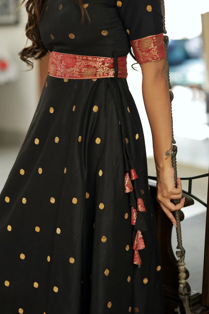 Confused about what to wear to your friend’s engagement ceremony? This Black chanderi cotton silk with gold butti ankle length dress has both the oomph and the elegance. The Benerasi woven lace belt and sleeve borders in contrast hues bring balance to the look while keeping it feminine and classy. The dress comes with the attached cotton lining.