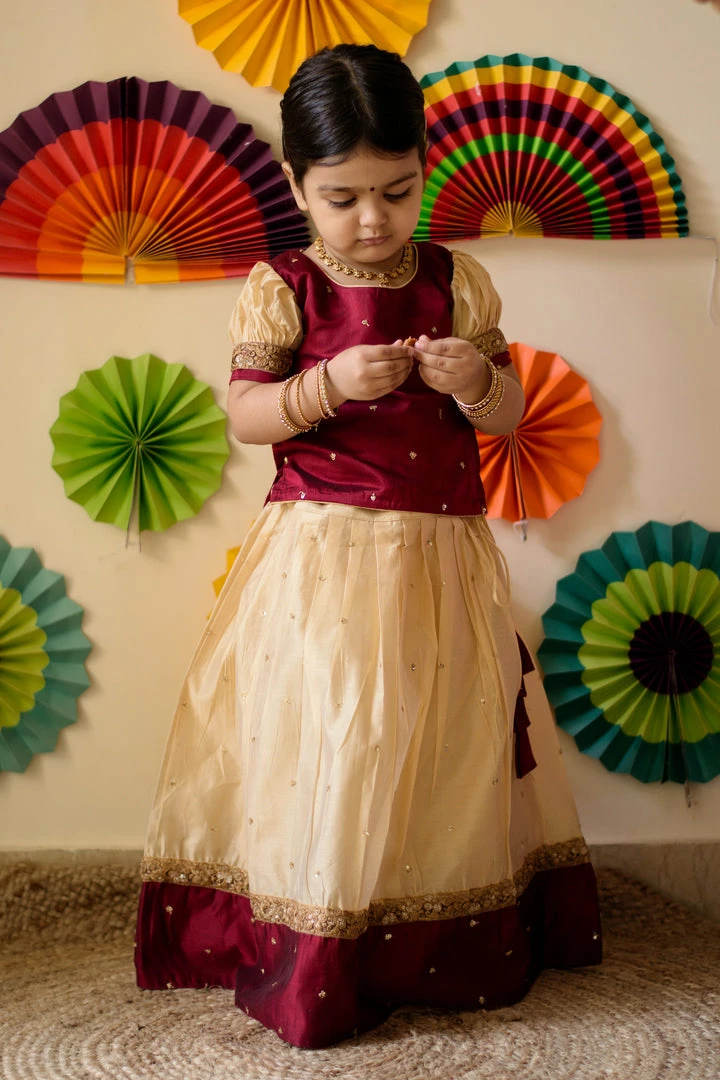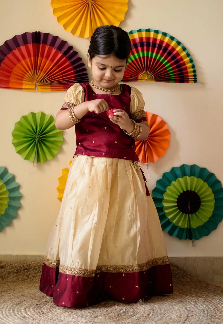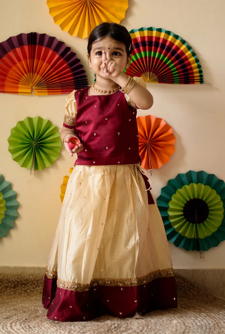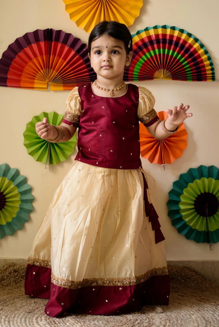 Chanderi sequins embroidered fabric with puff sleeves and border detailing.Â