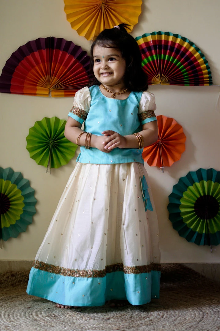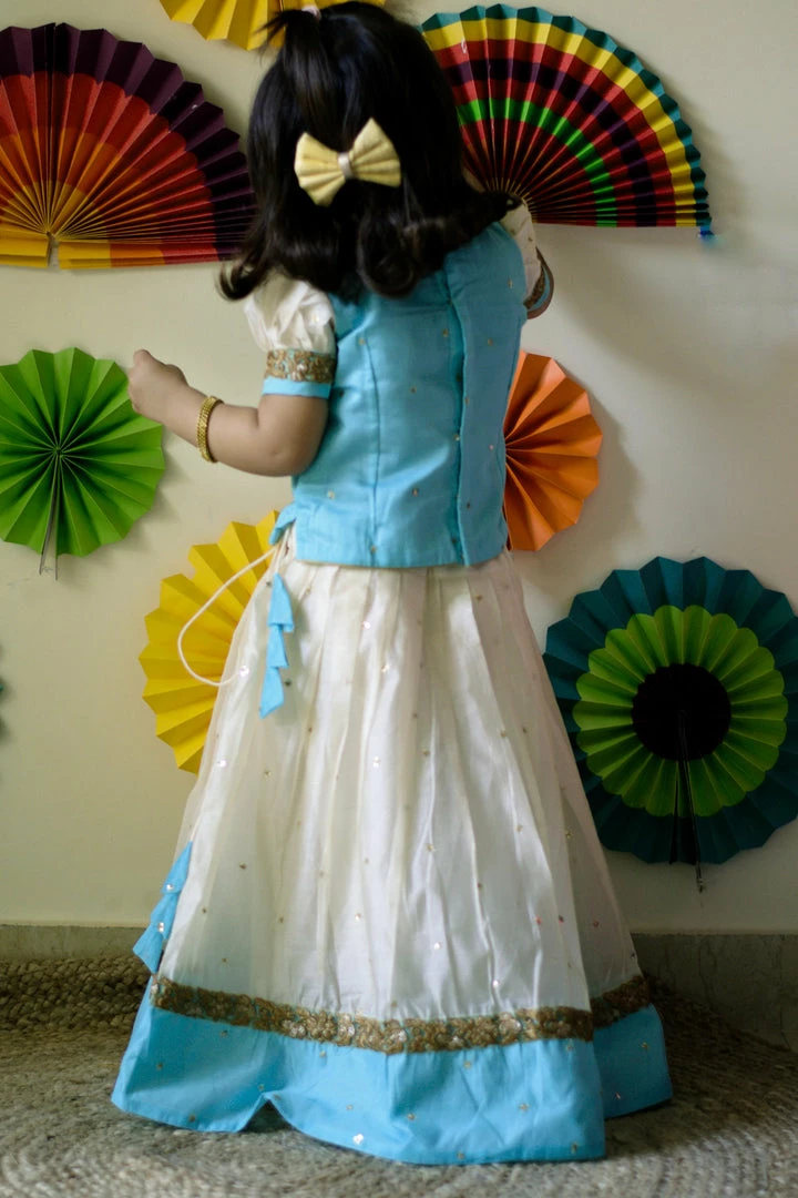 Chanderi sequins embroidered fabric with puff sleeves and border detailing.