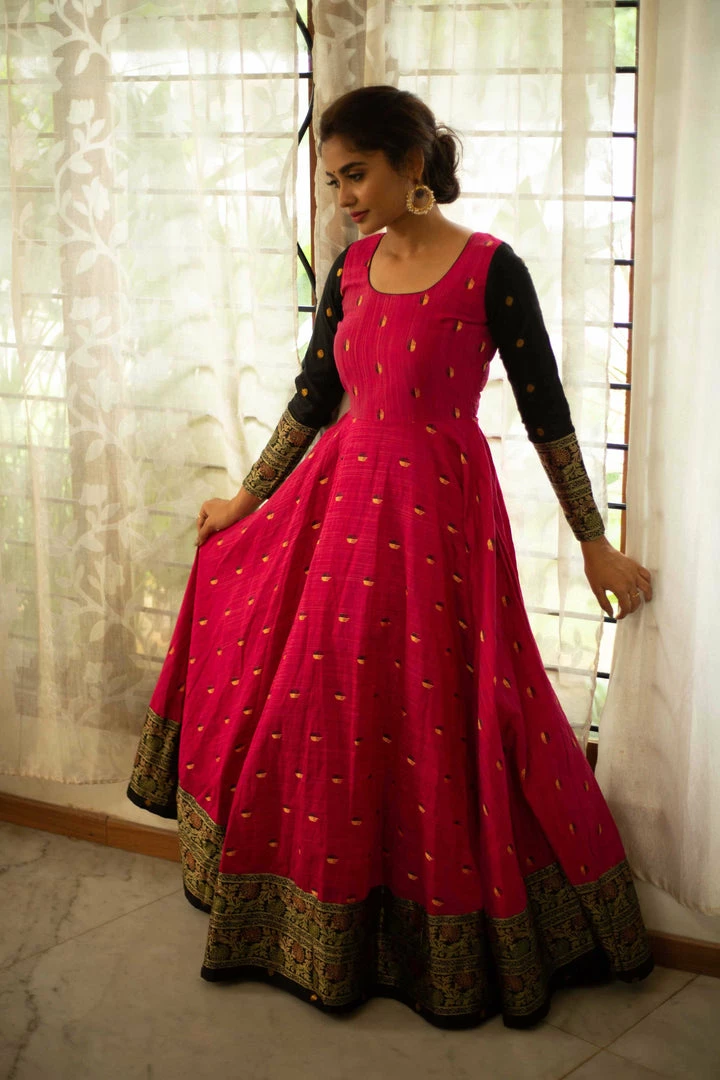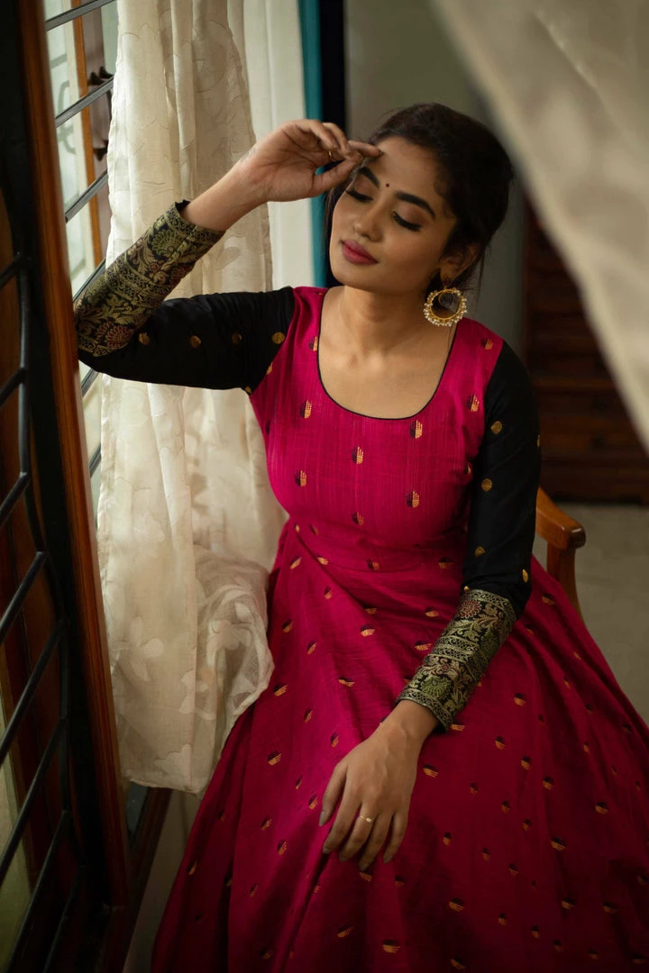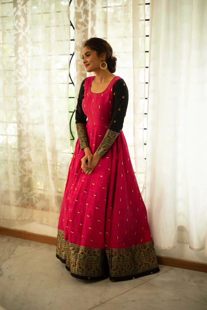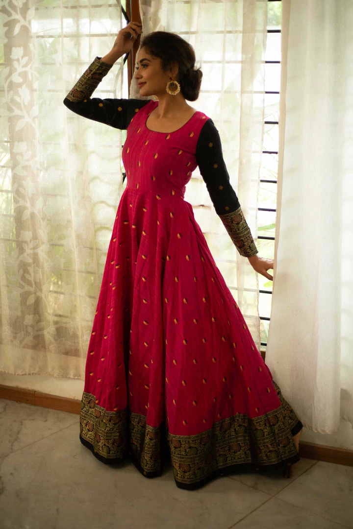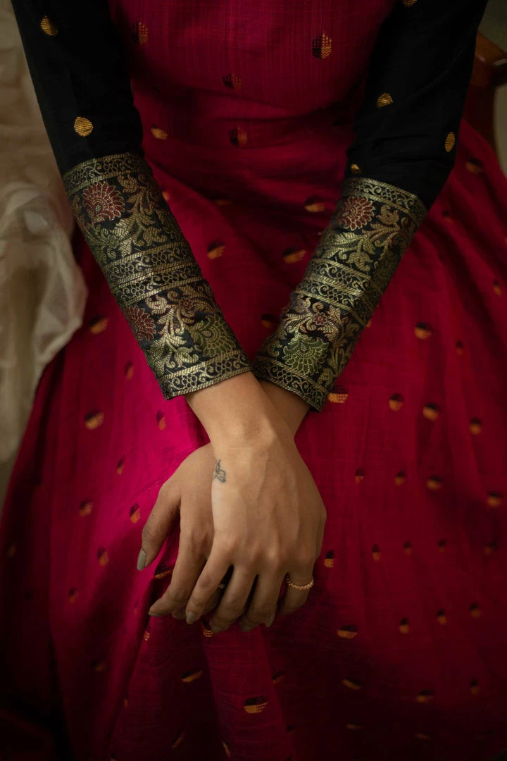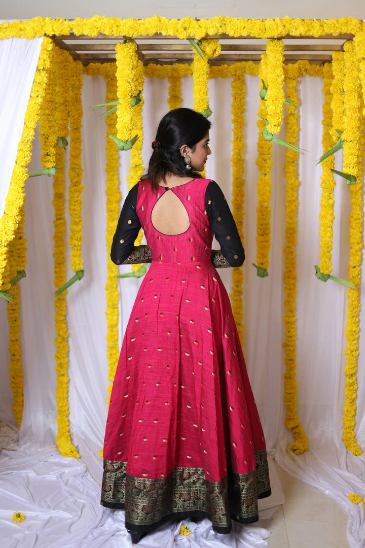 Magenta pink works exceptionally well with black. Contrast black Zari sleeves and the vibrant pink rings the festive mood!
