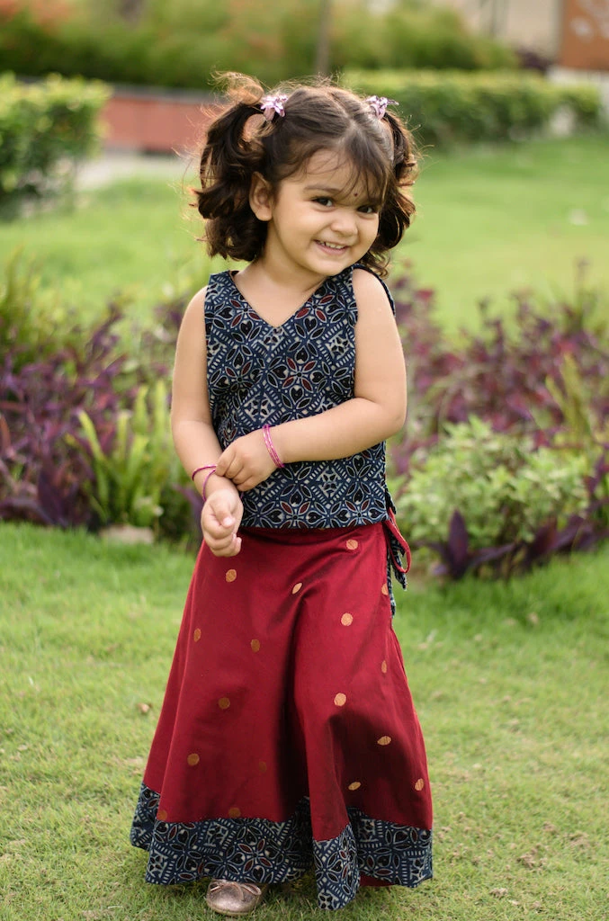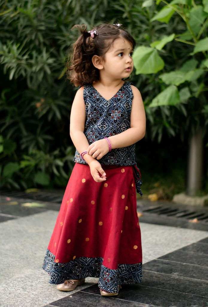 Ajrakh Cotton lining top with cotton silk chanderi skirt with patch border. Top and skirt fully lined.Â