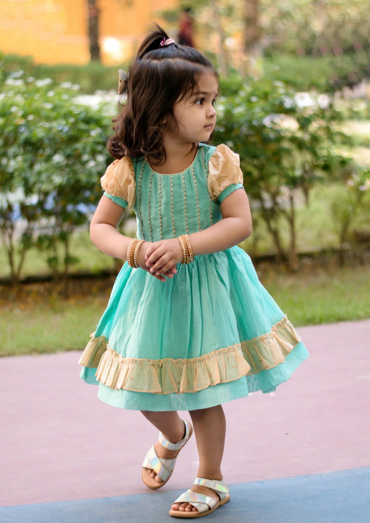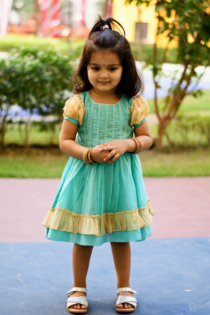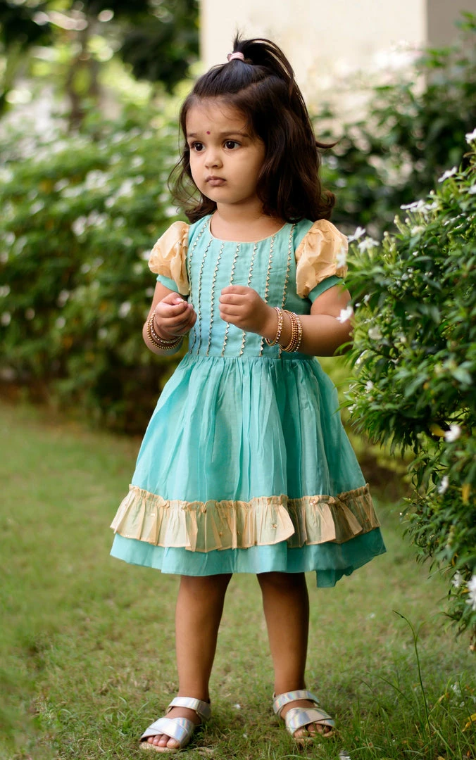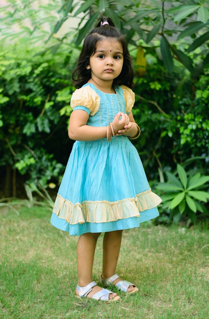Chanderi silk frock with contrast and lace detailing. Dress is lined with cotton.