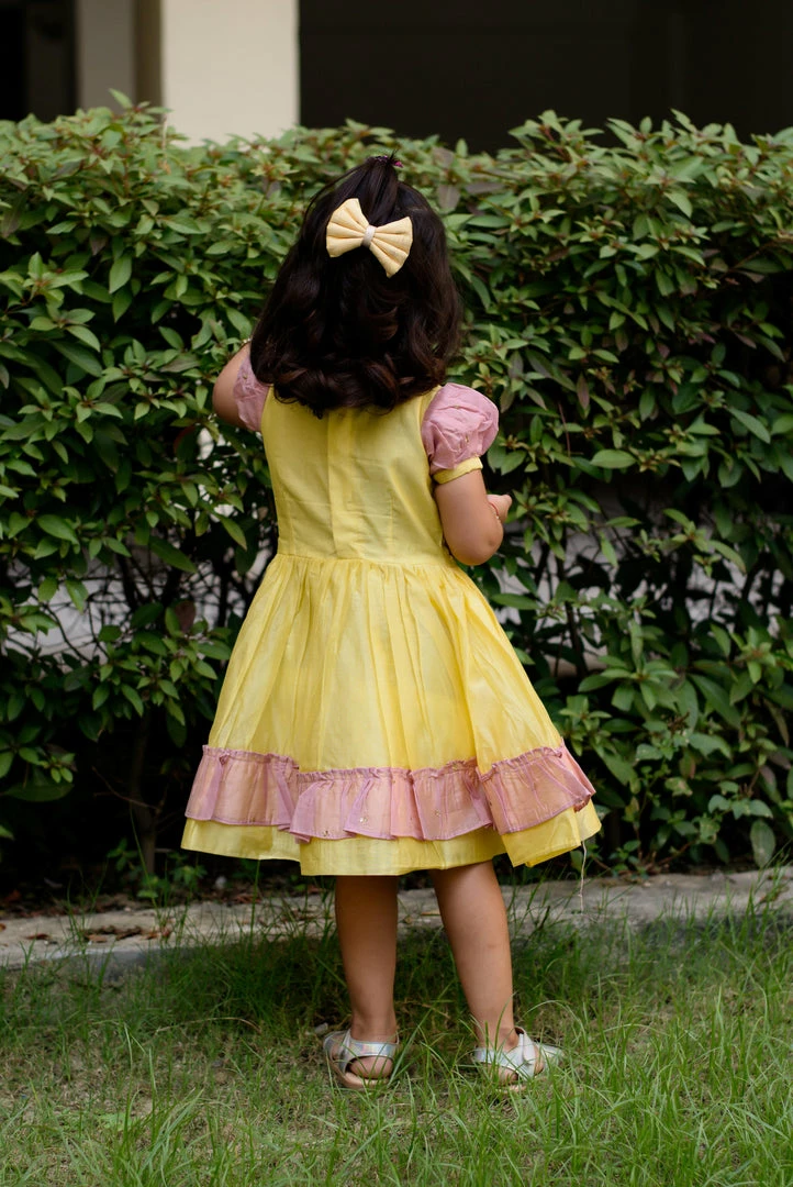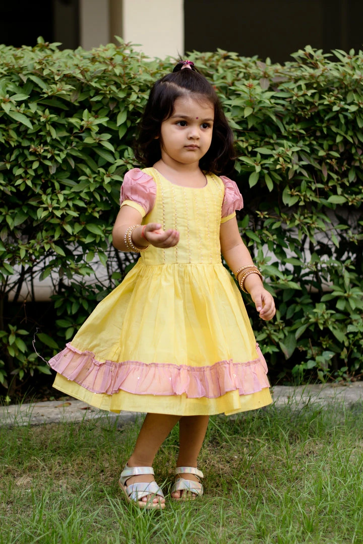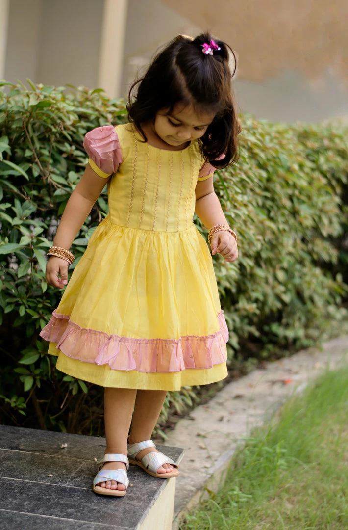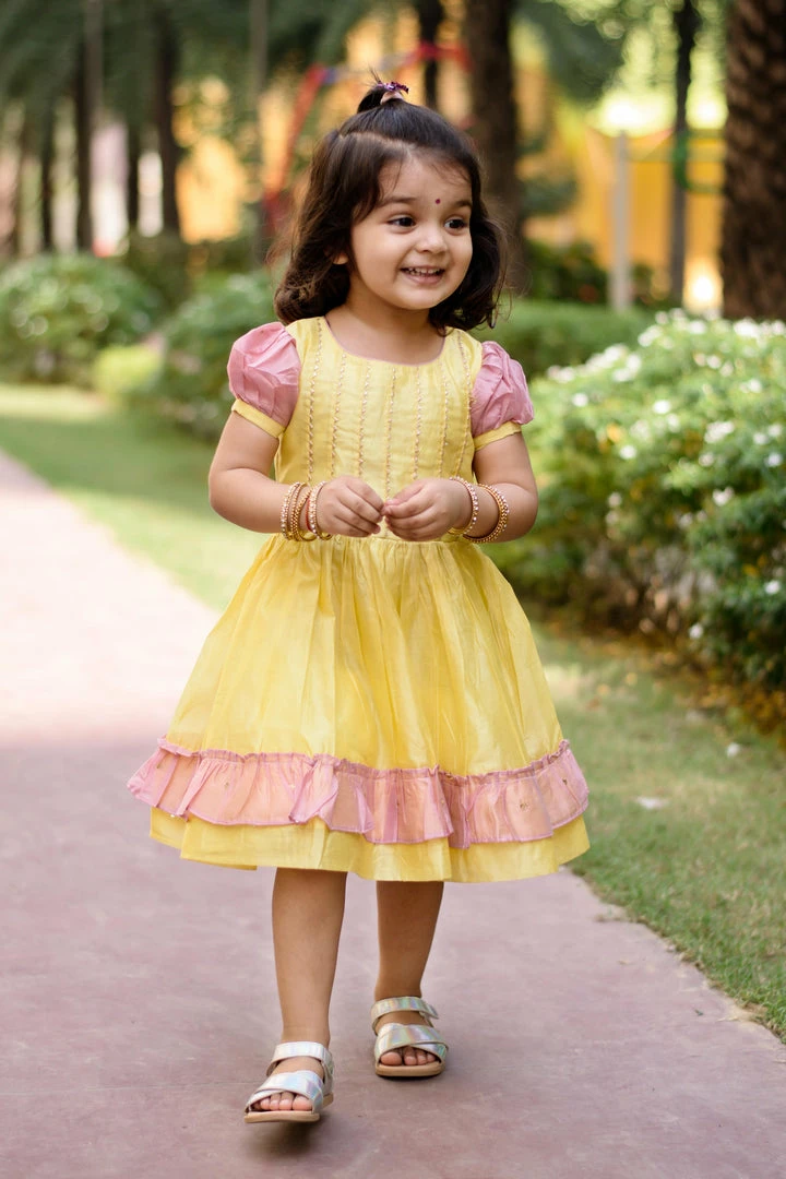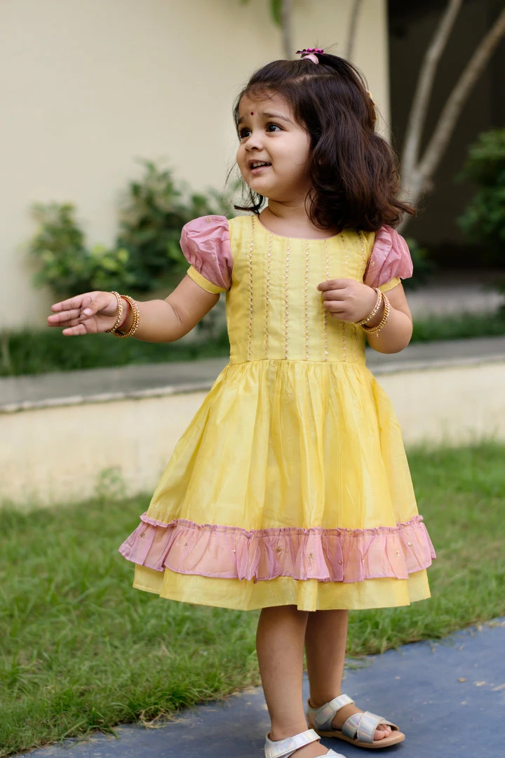 Chanderi silk frock with contrast puff sleeve and frill detailing. Dress is lined with cotton lining.