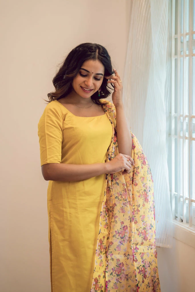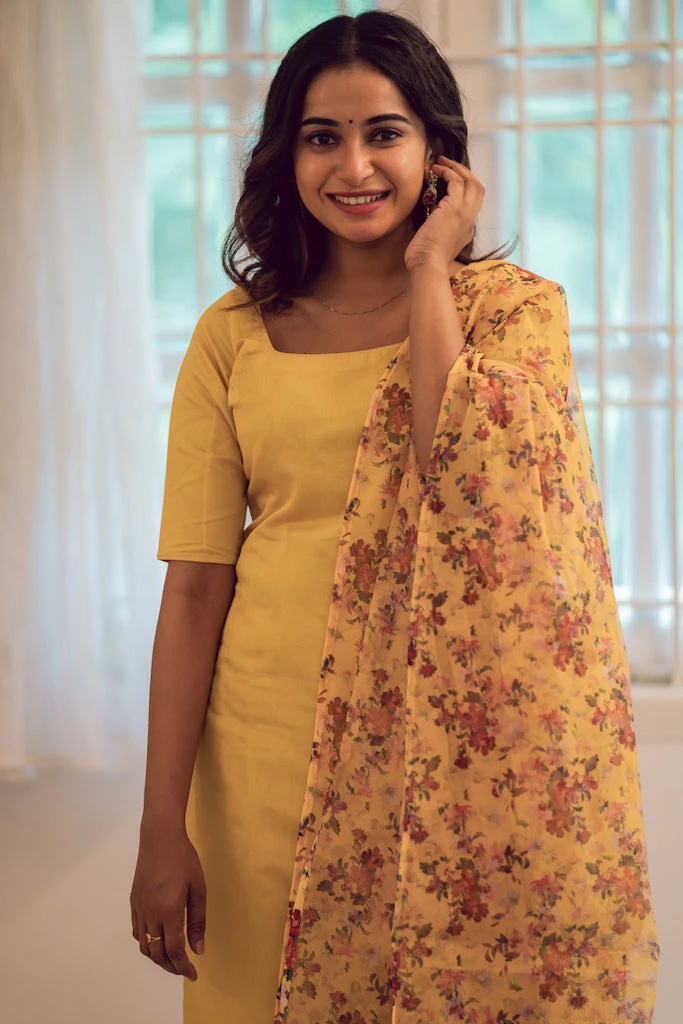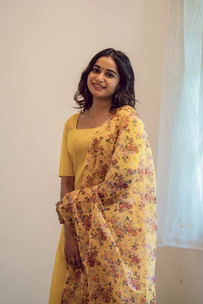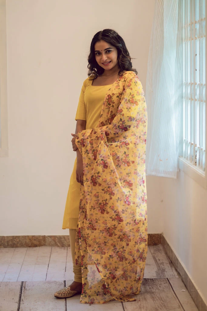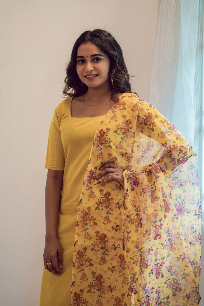 The season of festivals is here! Mango yellow works exceptionally well with yellow floral organza print dupatta .