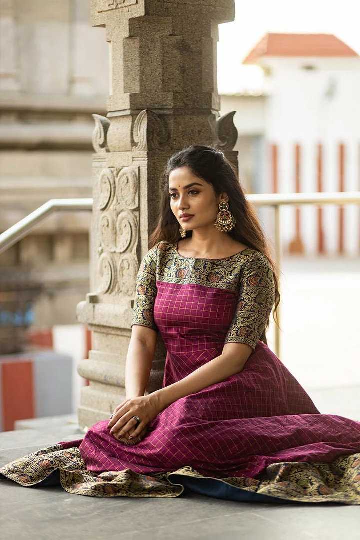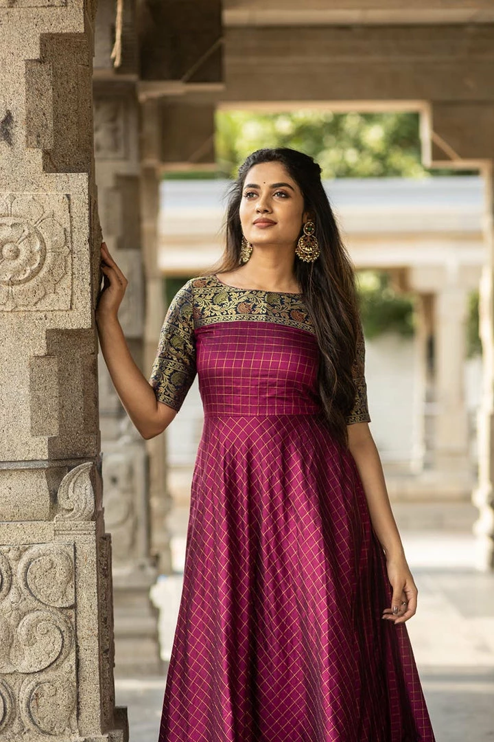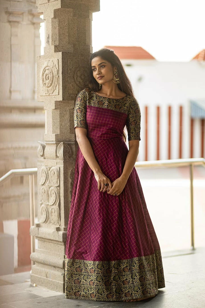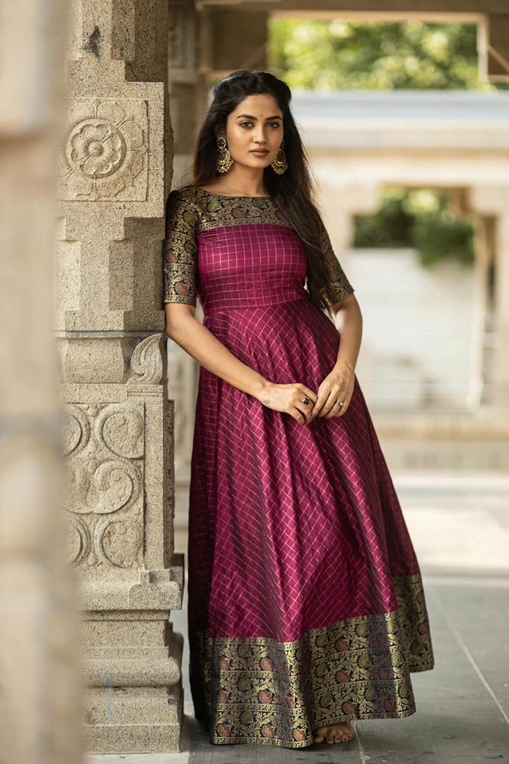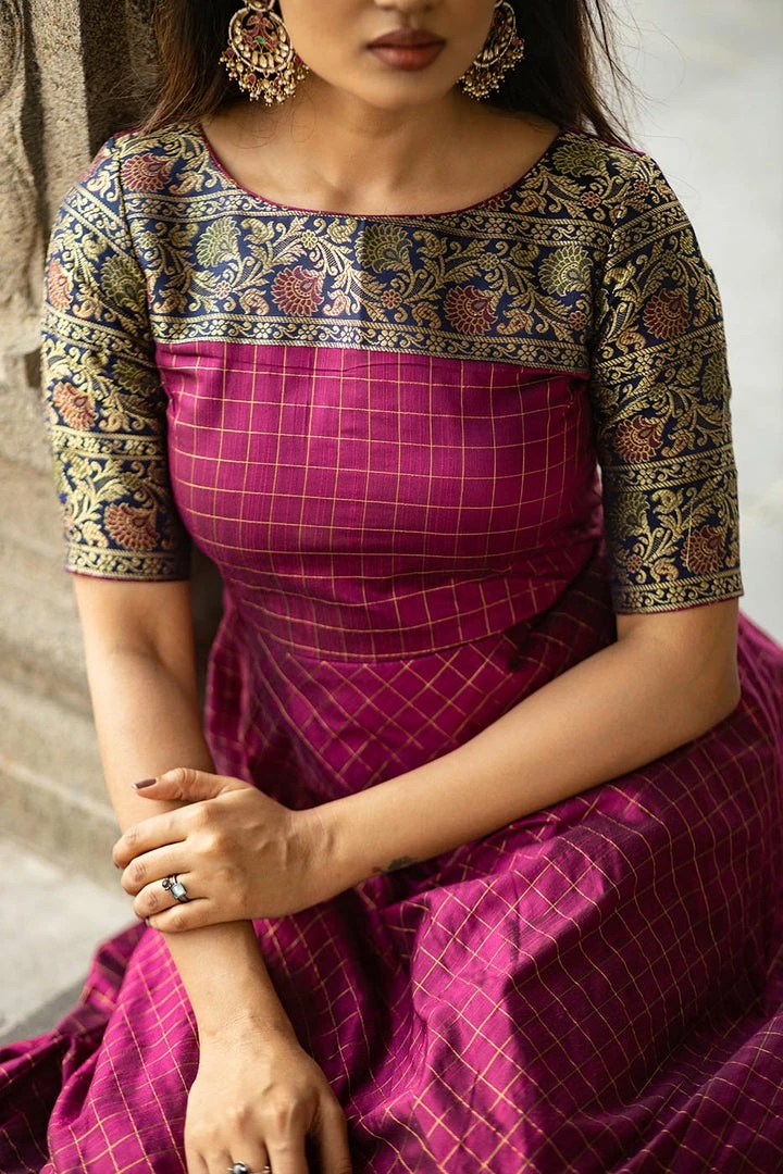 Bring out the traditional vibe of zari checks and banaras borders spunked with the modern silhouette of this maxi and detailed yoke in our latest creation. The dress is fully lined.