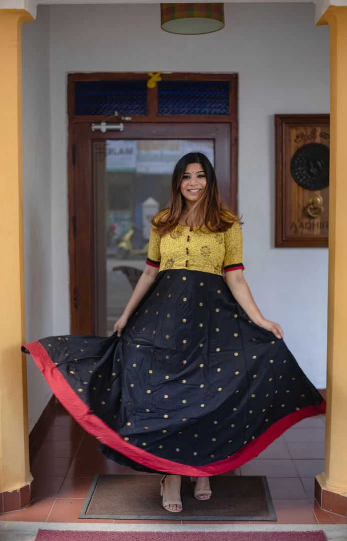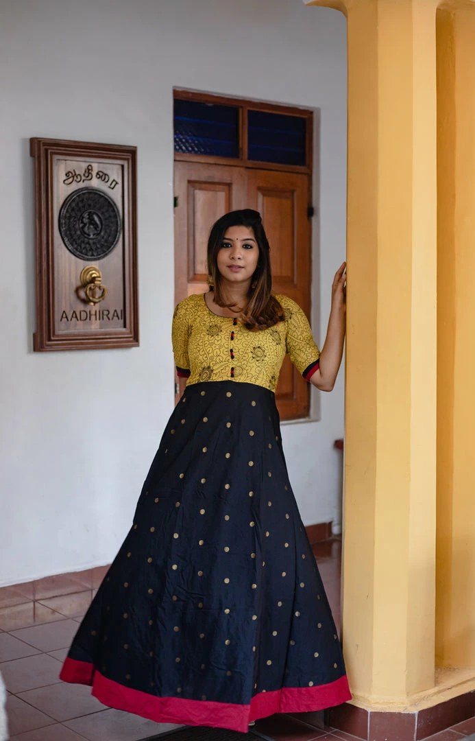 This Beautiful dress in black and yellow is a blend of chanderi cotton silk with buttis silk kalamkari fabric. Kalamkari is a magical art and takes almost a month to be created. As a token of respect to the fabulous art you must own one of these beauties. Absolutely a killer, this master piece is classic, elegant and regal.