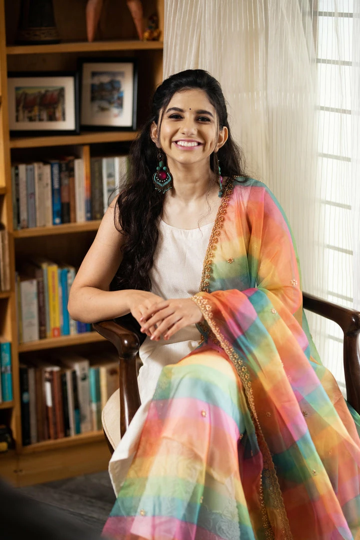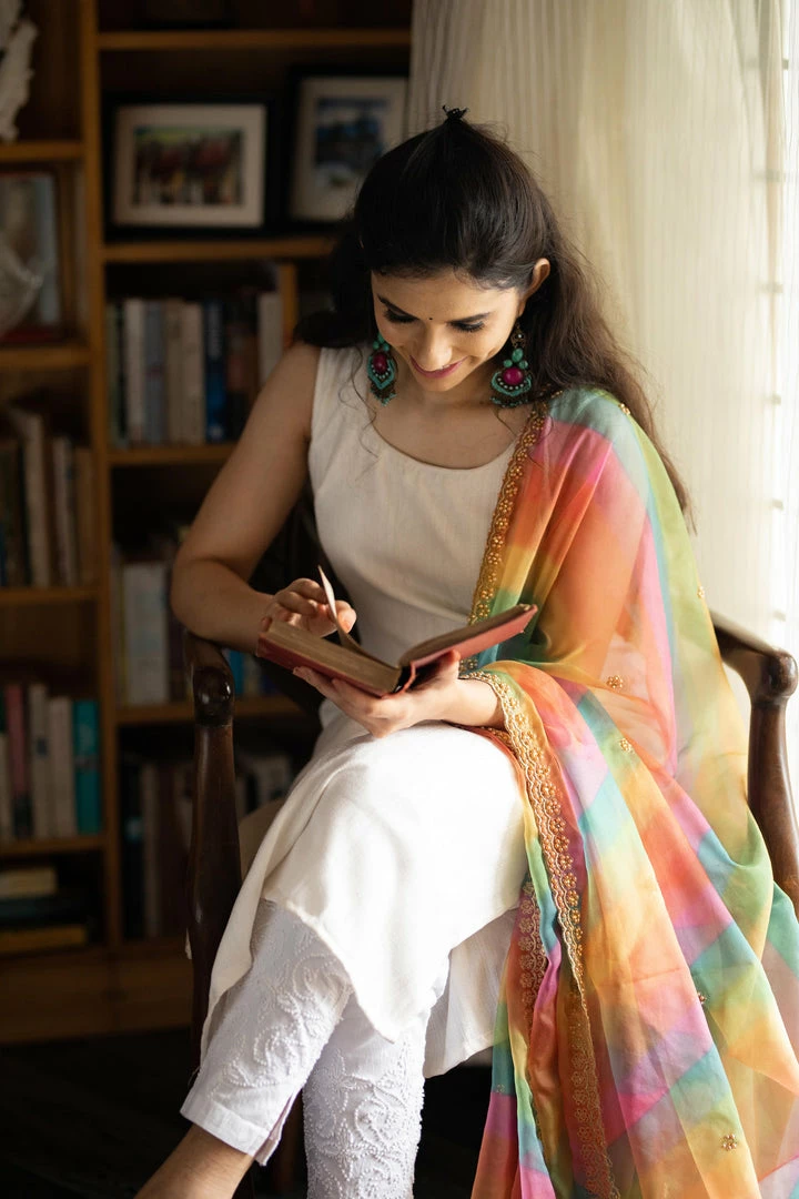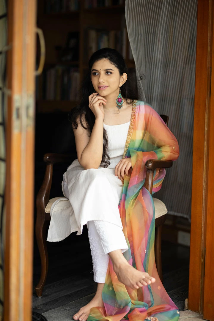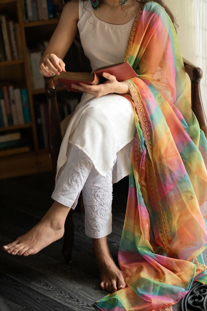 White semi khadhi silk kuti paired with embroidered multicolor soft organza dupatta. Set of top and dupatta