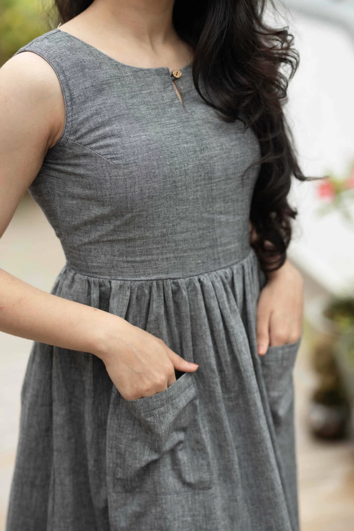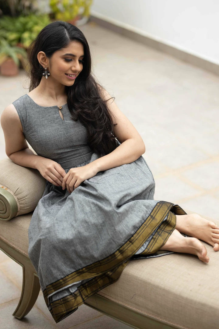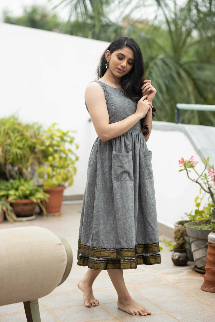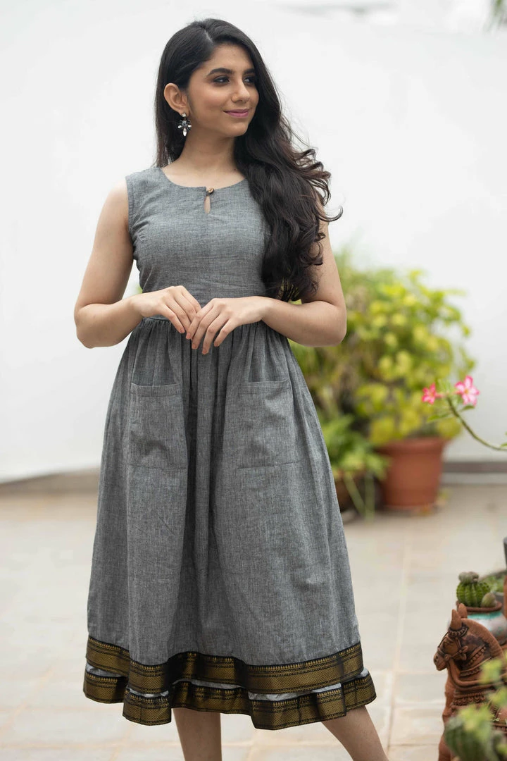 A Double Layered Mangalgiri Cotton Dress With Two Front Pockets ,a safe bet for a semi-formal outing.Sleeves can be included upon request.