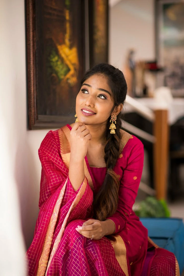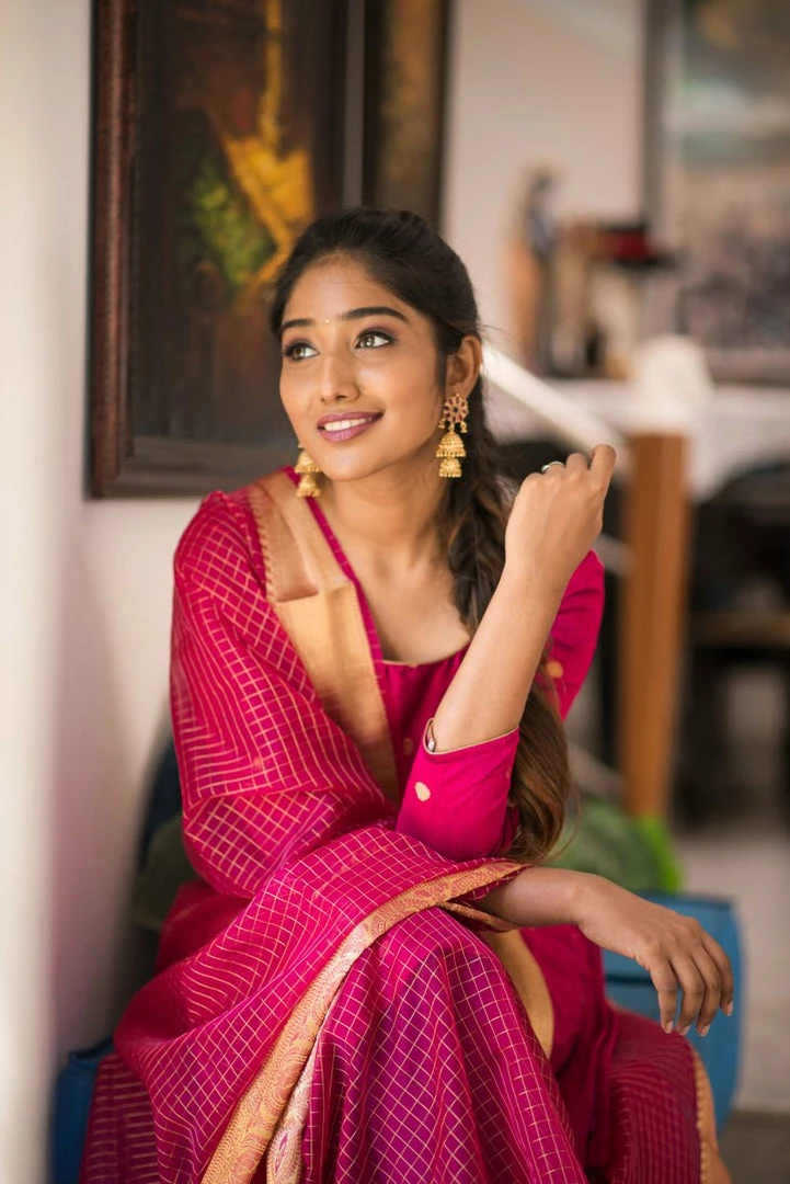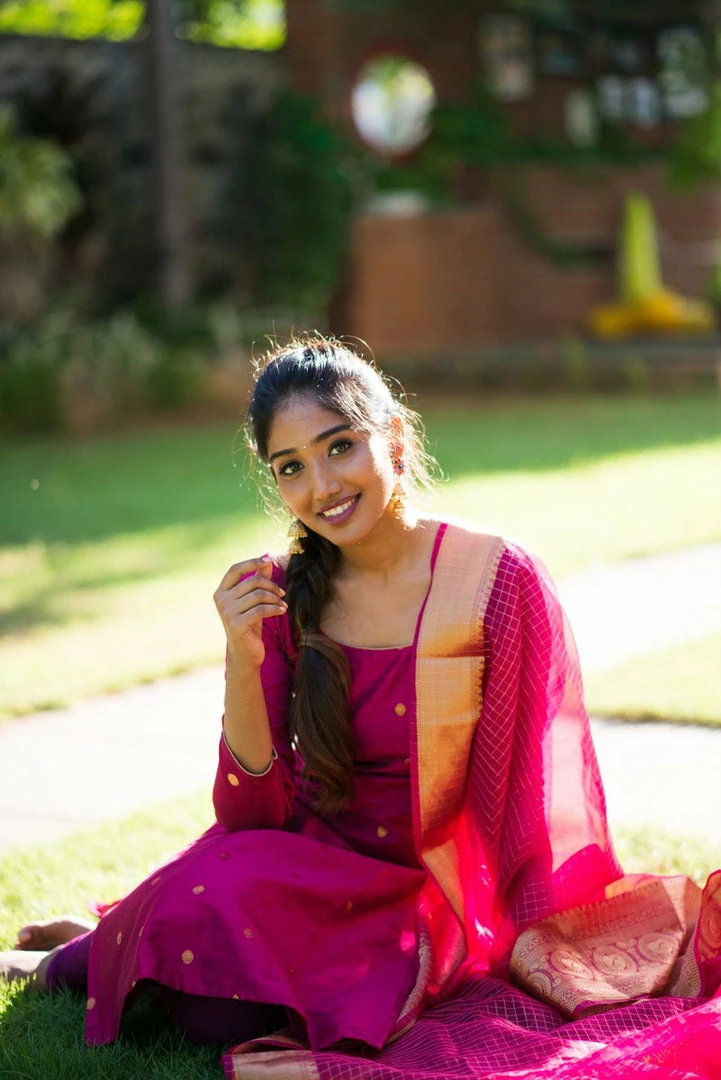 Rani pink chanderi kurti comibed with zari soft organza dupatta with rich zari border is a perfect outfit for this festive season.j